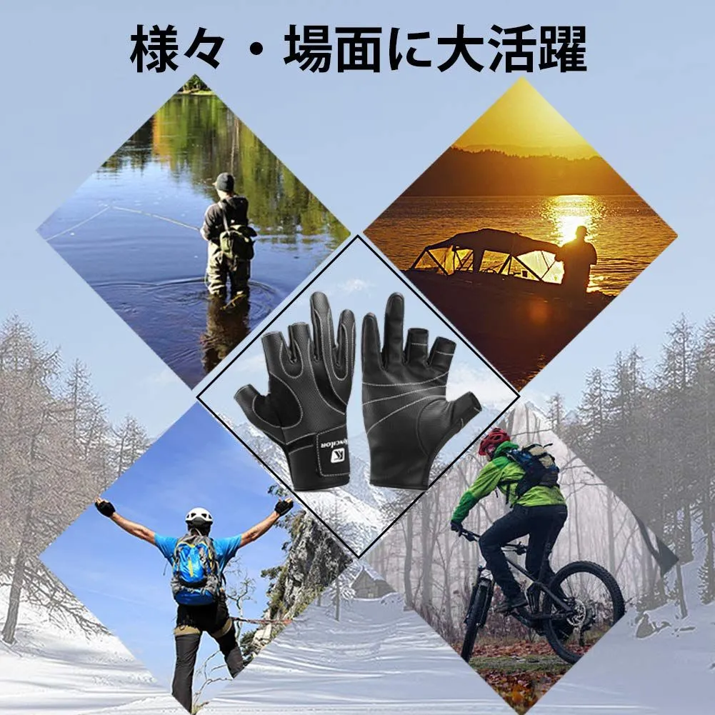 【滑り止めデザイン】手袋のひらの部分には滑り止めのポリウレタンの皮革を採用して、摩擦を増加して、耐摩耗性を強めました。汗で湿ったグローブでも、物を掴む際にしっかりホールドできます。運転するとき、ハンドルの制御力も高めます。悪天候の中でもしっかりとバイクのハンドルを握って安全に走行することができます。釣りにはもちろん、車の運転、自転車の通勤、登山などのアウトドア活動をする時にも最適です。