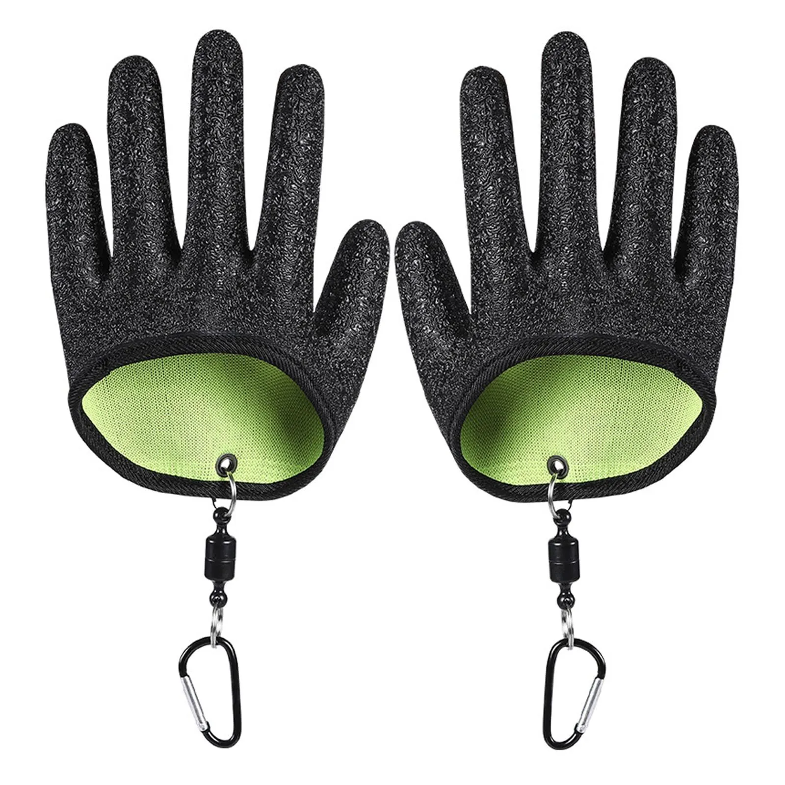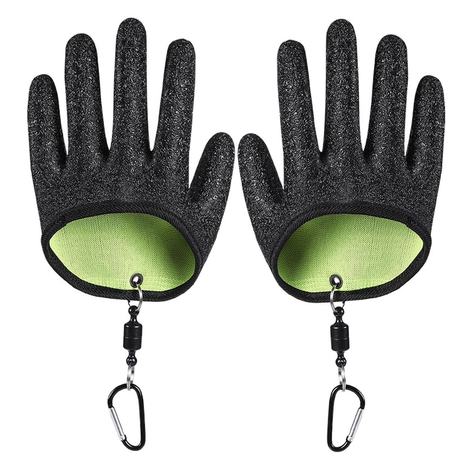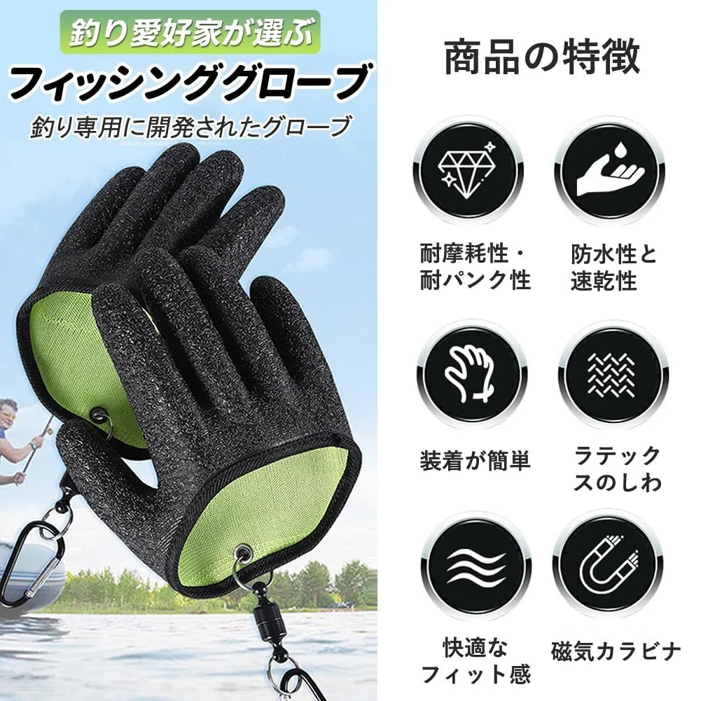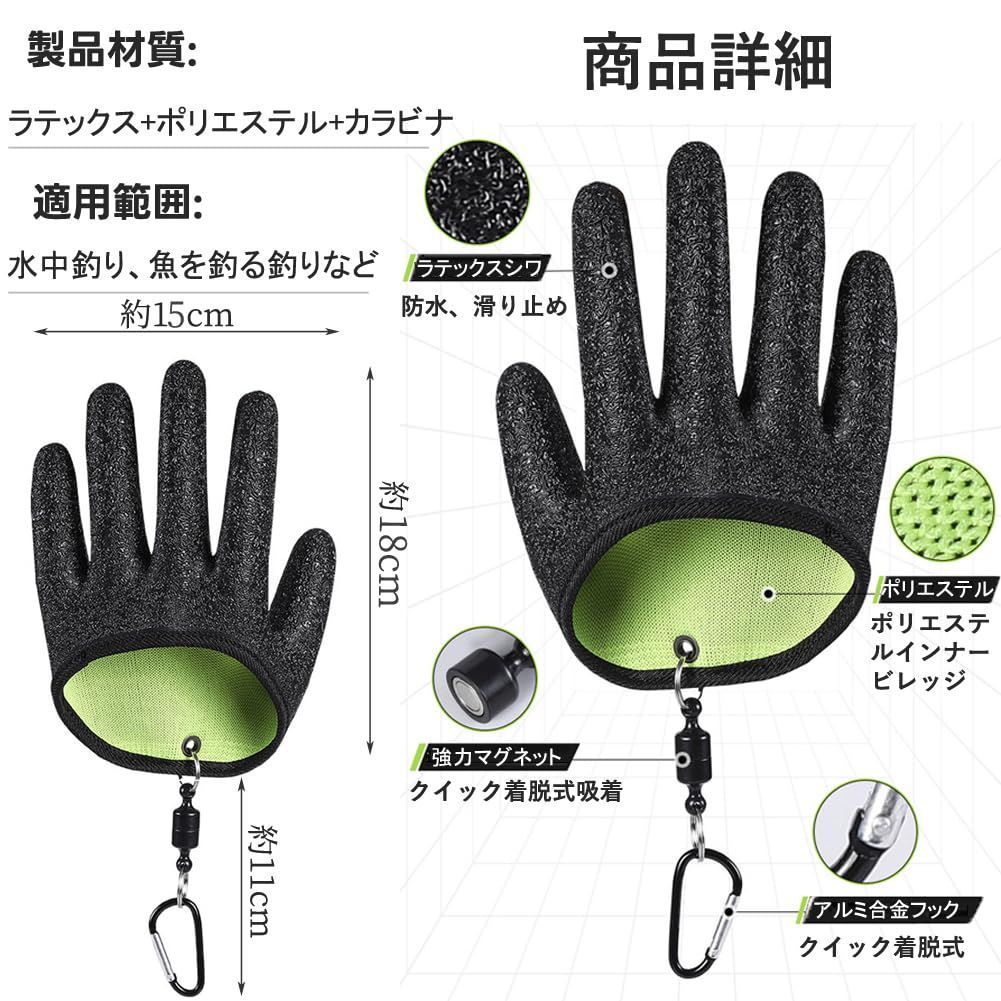 【商品仕様】 釣用手袋1組、全長約18cm、マグネットカラビナフック付き。素材:ラテックスシワ+ポリエステルニット+スナップファスナー。