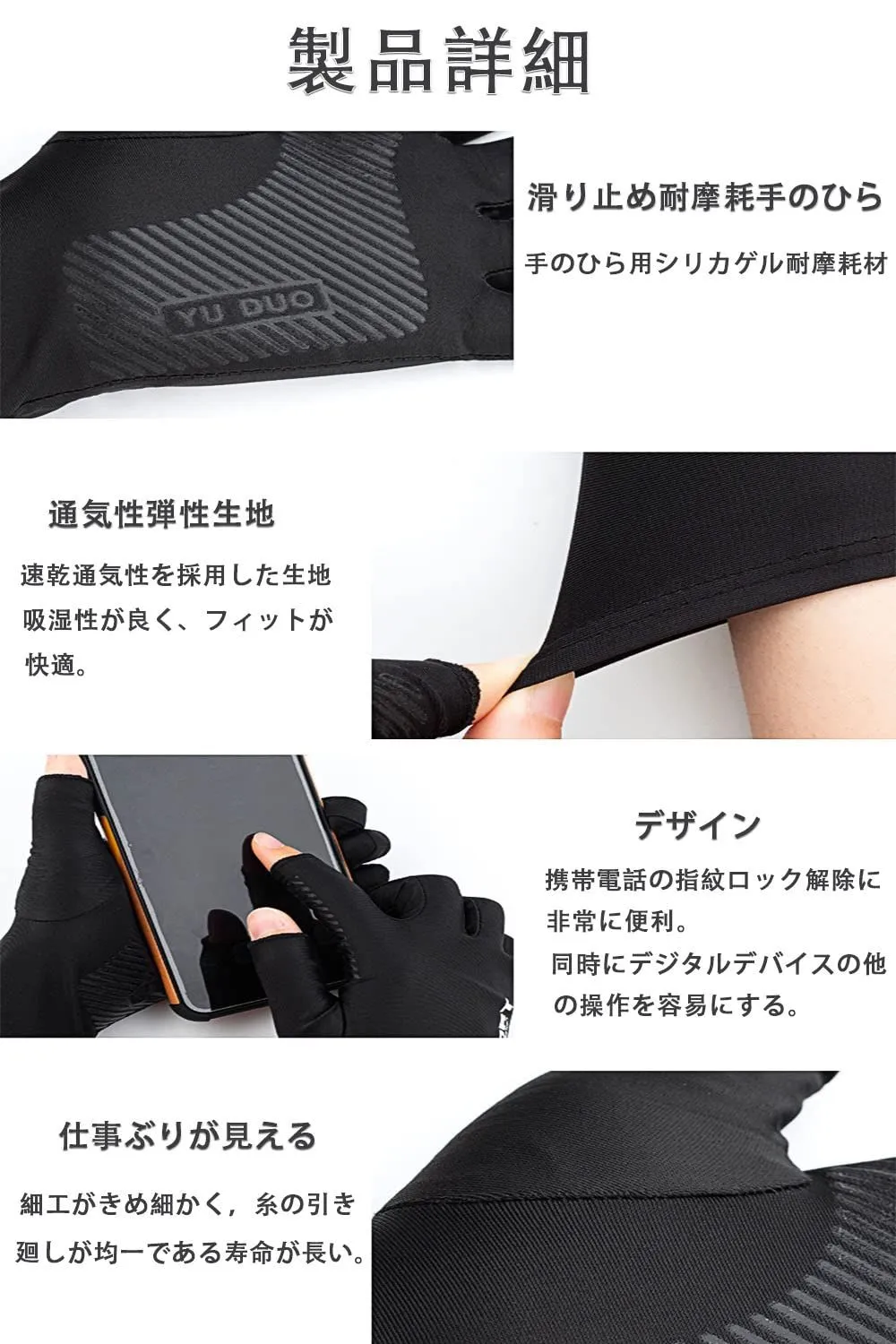 【素材】通気性のある生地、材質は通気性があり、弾力性があり、高密着、手のひらの滑り止め効果が良い。