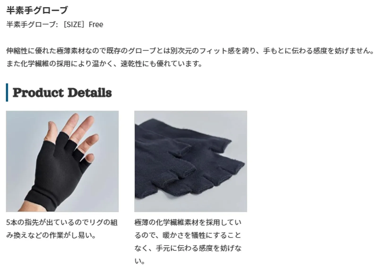 伸縮性に優れた極薄素材なので既存のグローブとは別次元のフィット感を誇り、手もとに伝わる感度を妨げません。 また化学繊維の採用により温かく、速乾性にも優れています。