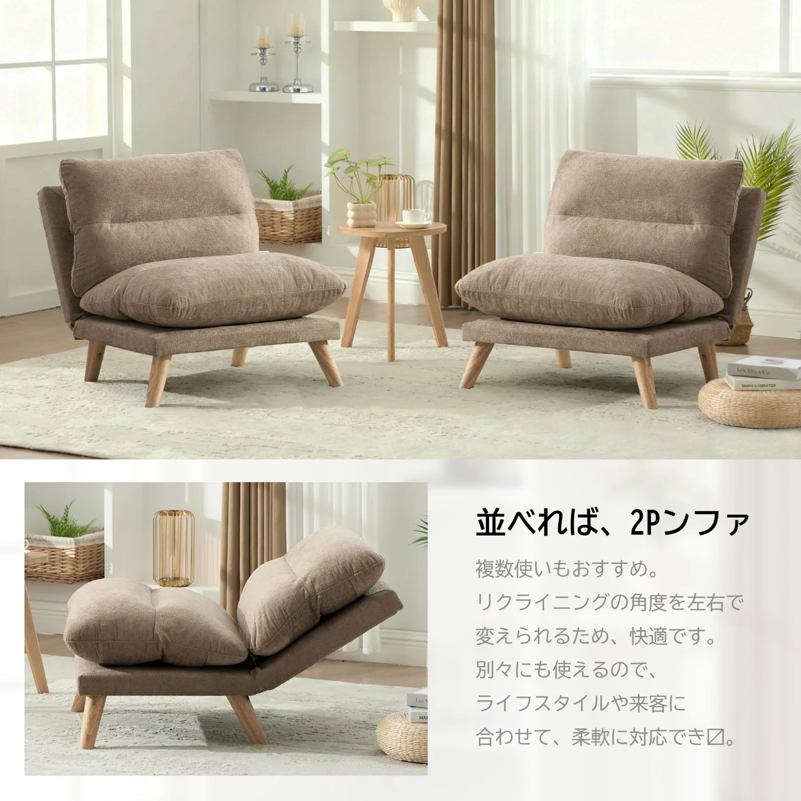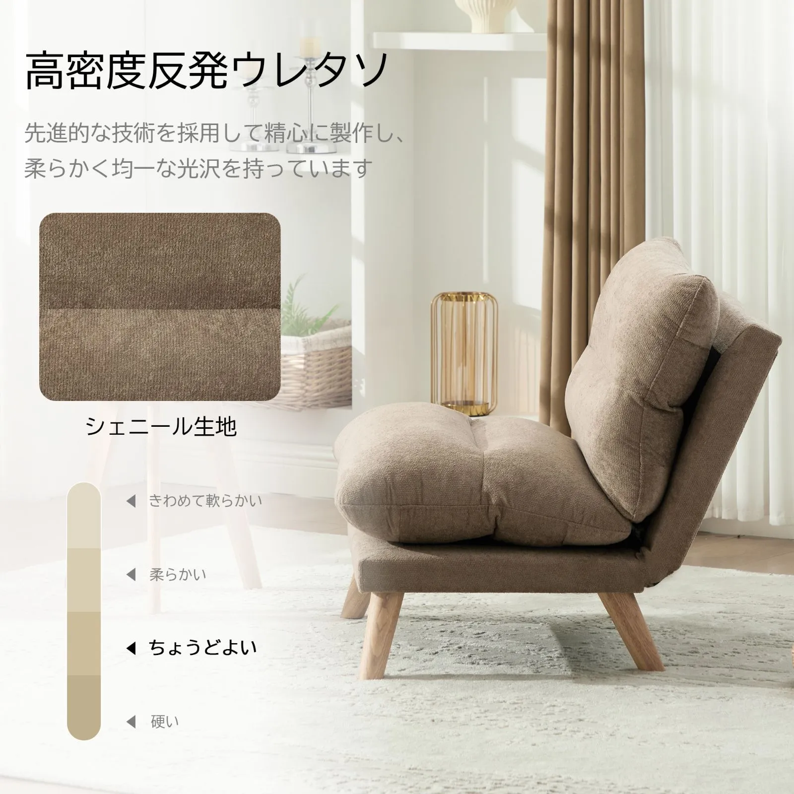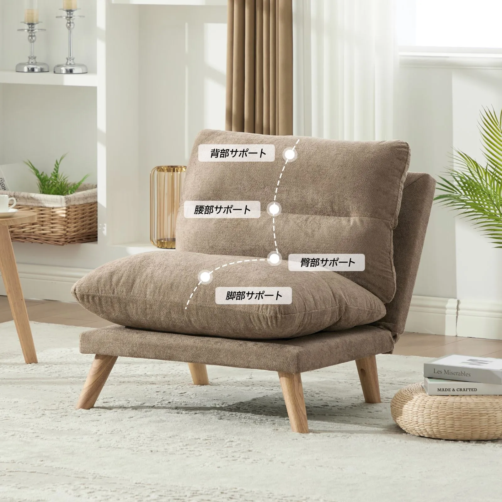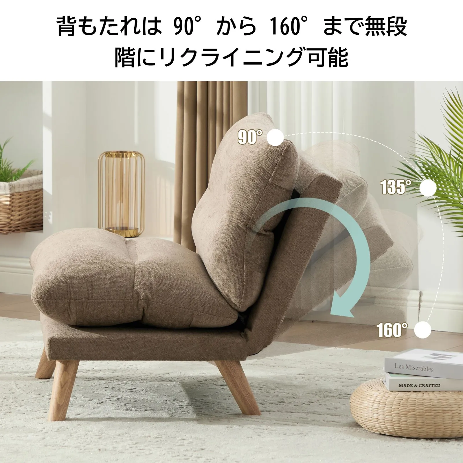 【90°〜160°多段階リクライニング】 自由な角度調節で、読書や休憩などシーンに合わせた快適な姿勢を実現。背中と腰にフィットし、最高のくつろぎを提供します