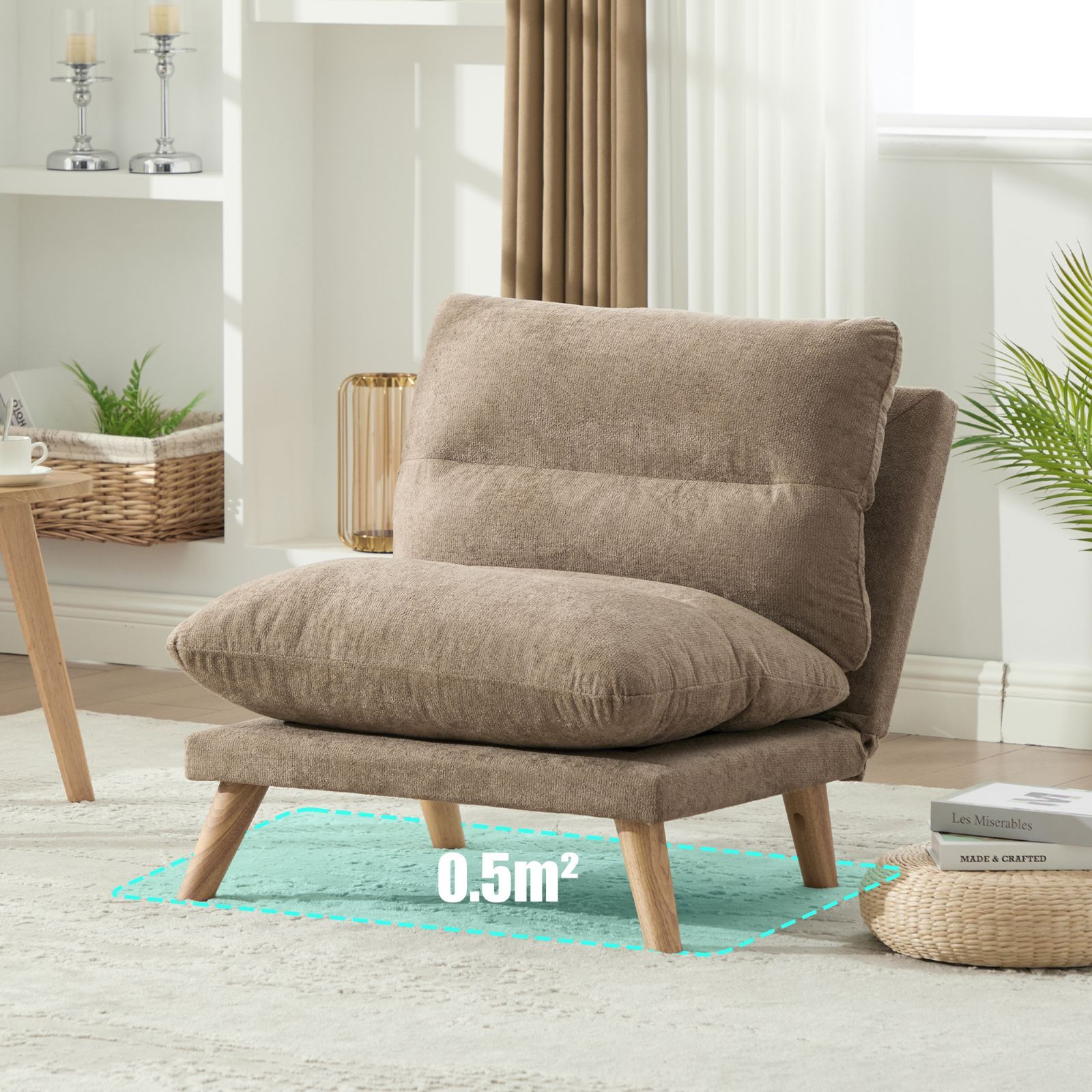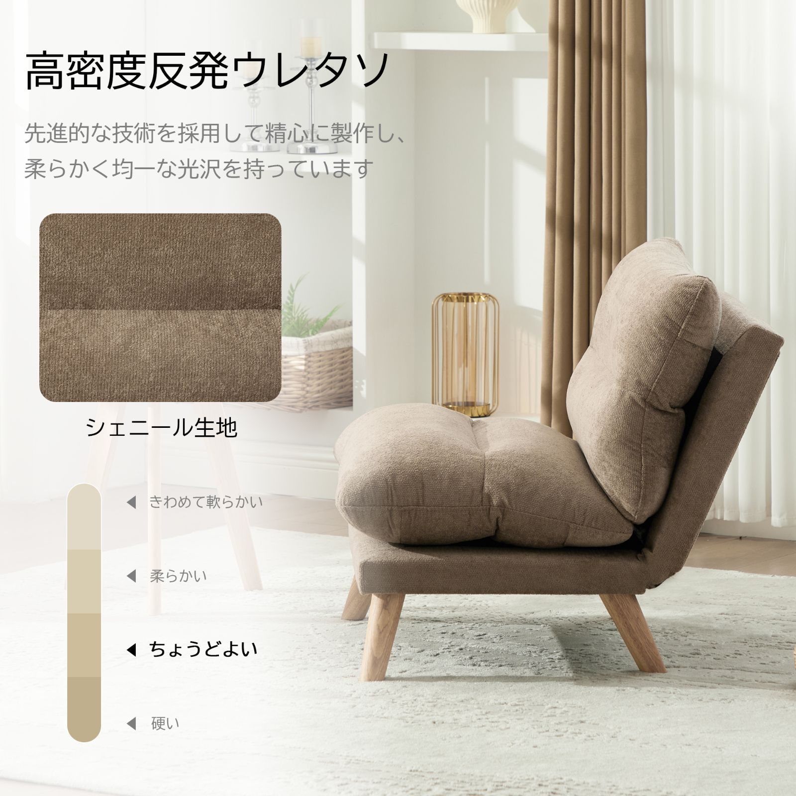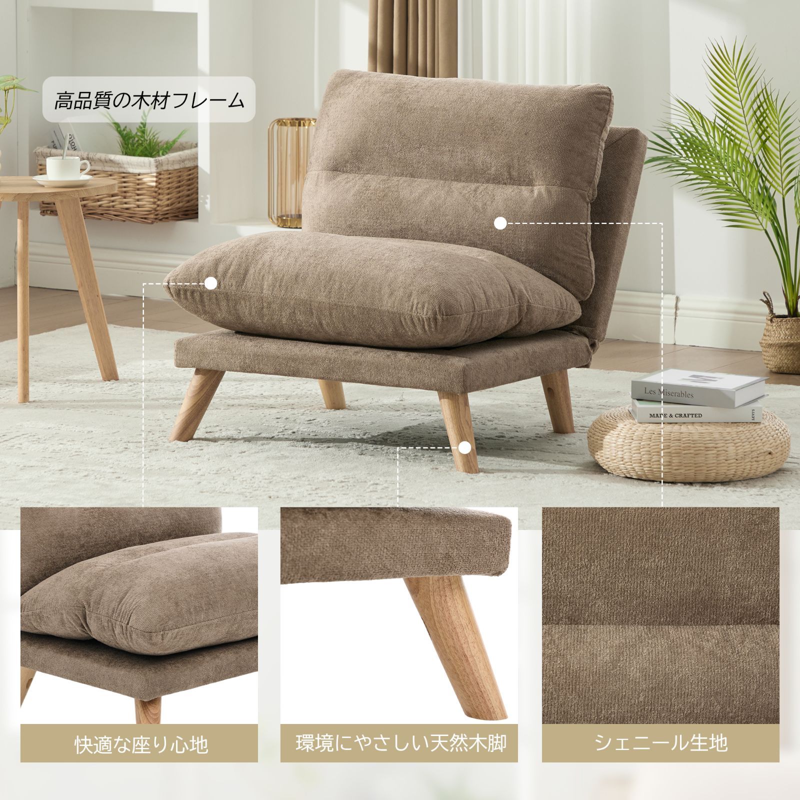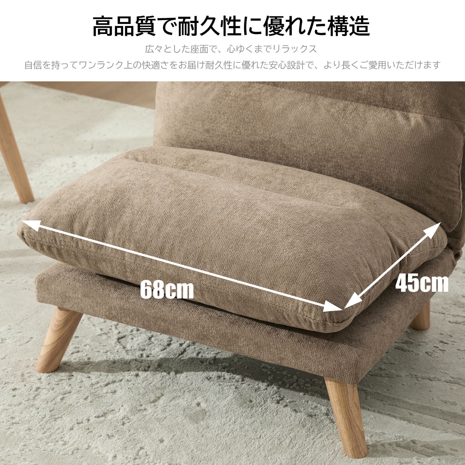高品質シェニール生地、無垢材フレーム、低反発メモリーフォームを使用した一人掛けソファです。90°から160°まで多段階にリクライニング可能で、シーンに合わせた自由な体勢でおくつろぎいただけます。人間工学に基づいたデザインで、背中と腰にしっかりフィットし、長時間座っていても疲れにくい極上の座り心地を実現。幅68cmのコンパクト設計と約13kgの軽量設計により、一人暮らしの部屋や寝室、バルコニーなど、場所を選ばずに設置や移動が簡単です。耐久性に優れた素材とフレームで、安心してお使いいただけます