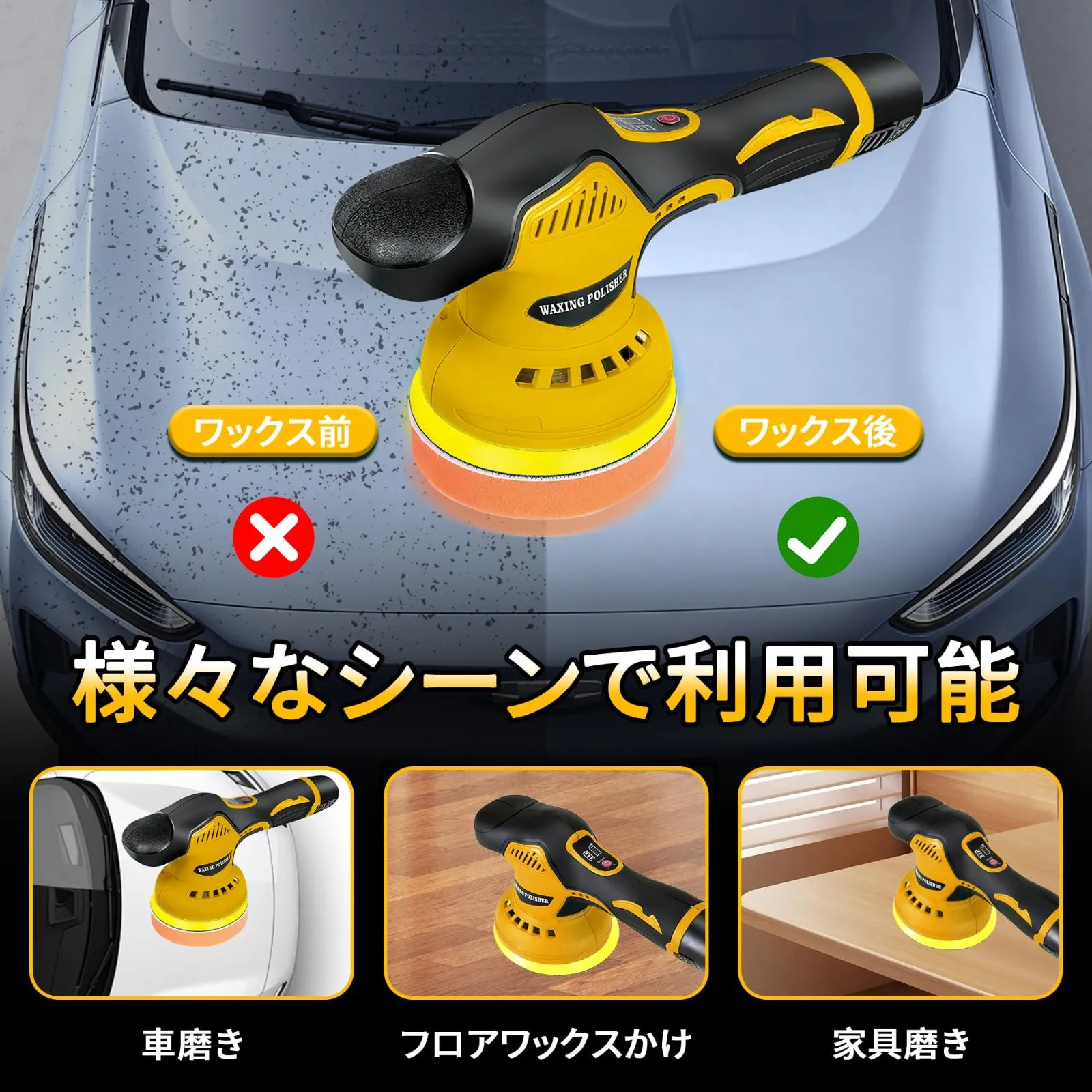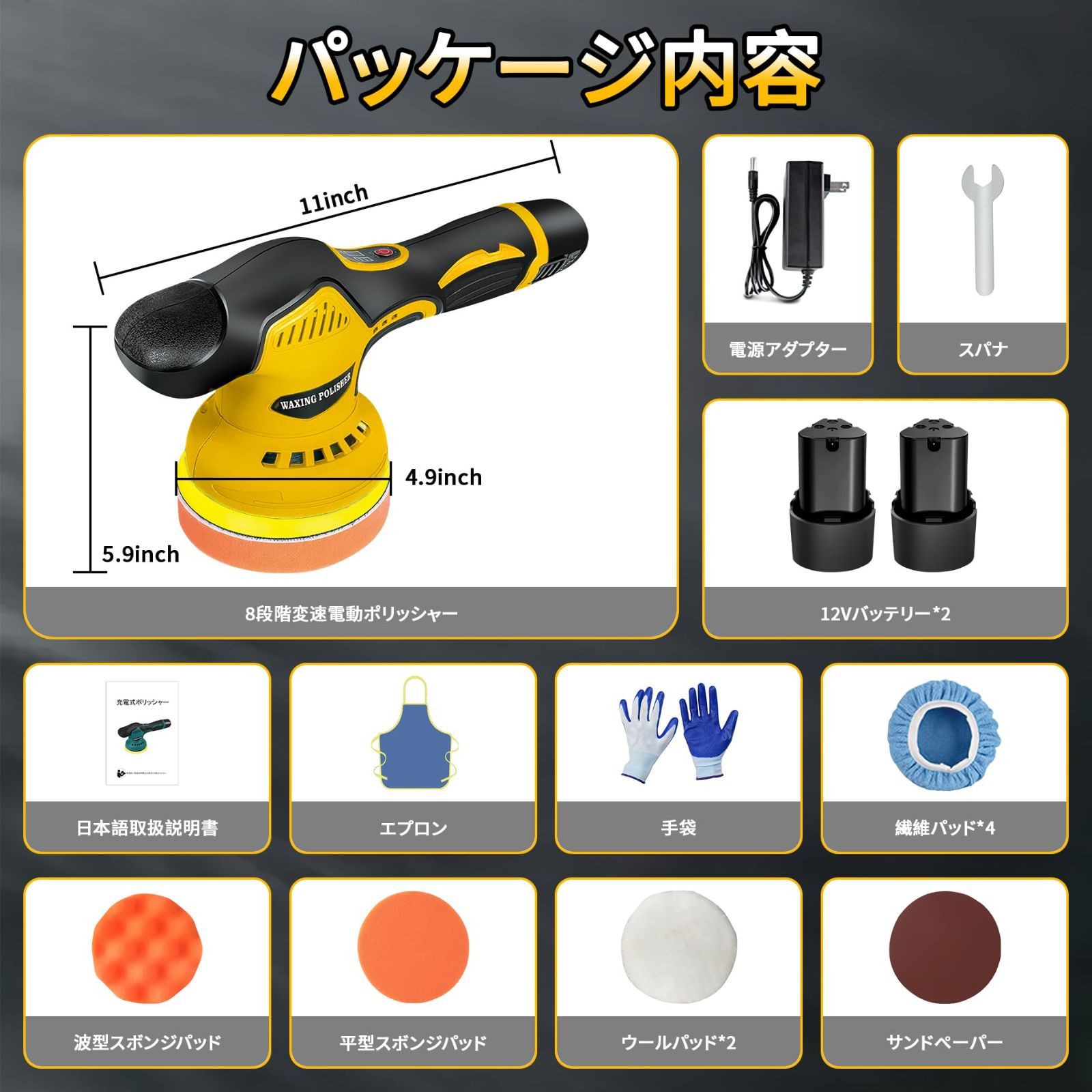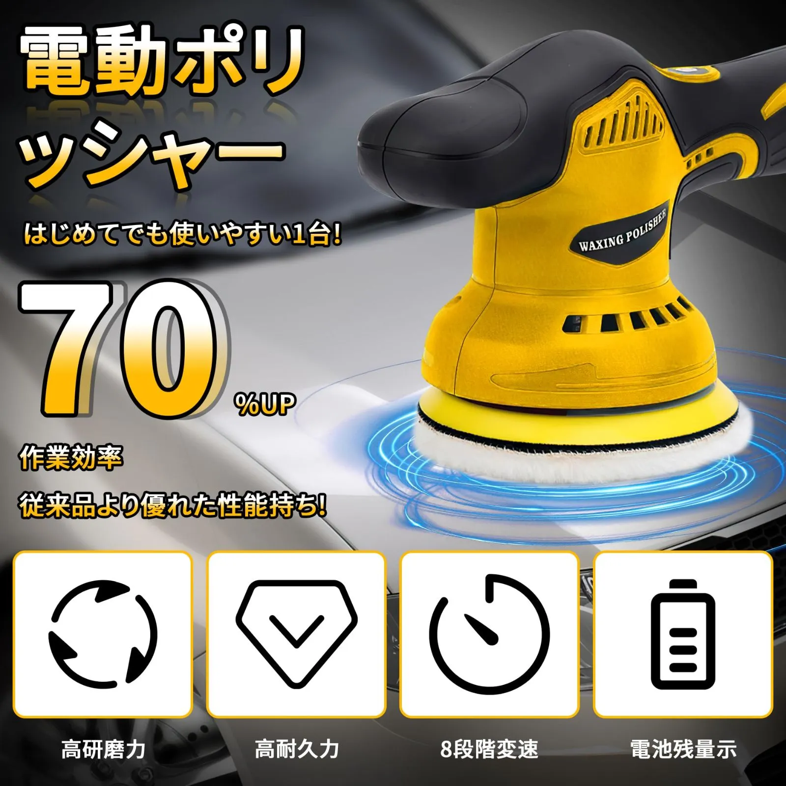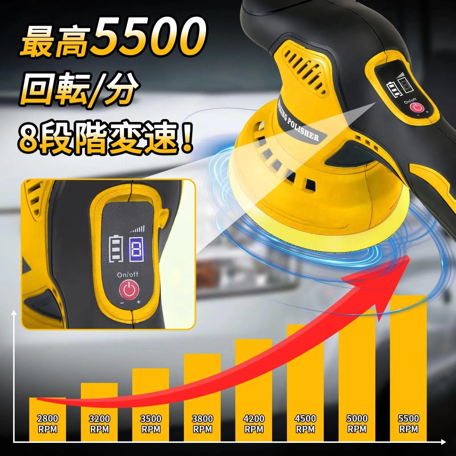 【2025強化版】ポリッシャー 充電式ポリッシャー 電動ポリッシャー 12V ダブルアクション ポリッシャー 8段階変速 125mm コードレス ポリッシャー 大容量バッテリ一2個搭載 車 コードレスポリッシャー 研磨 ポリッシャー 洗車 車磨き 鏡面磨き 傷消し 艶出し ワックス 電動ポリッシャー (イエロー)