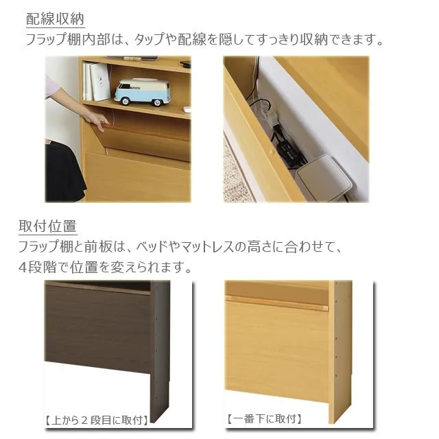 ◆フラップ棚と前板は、ベッドやマットレスの高さに合わせて、4段階で位置を変えられます。