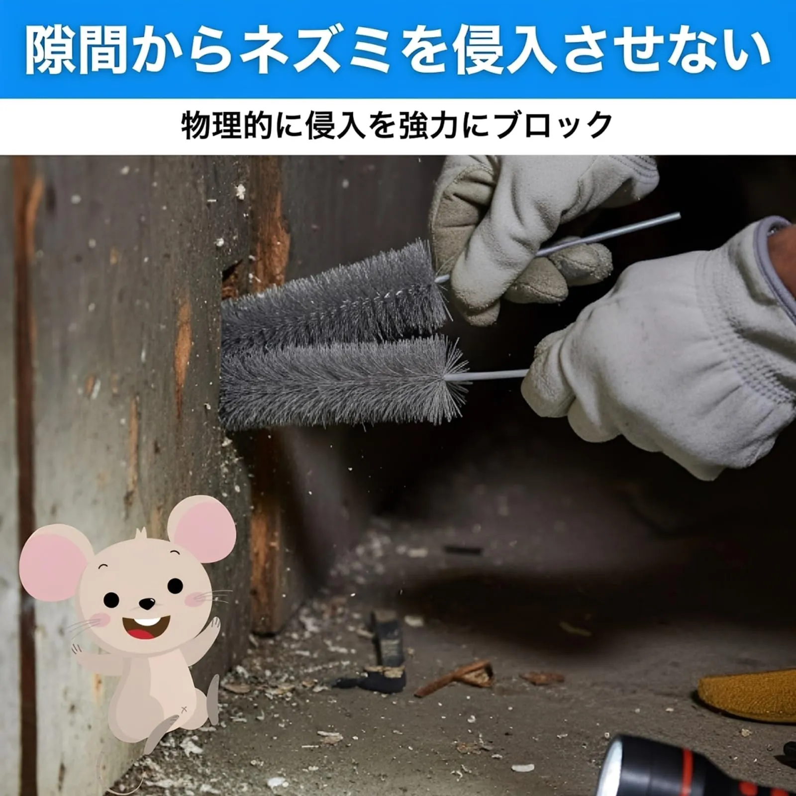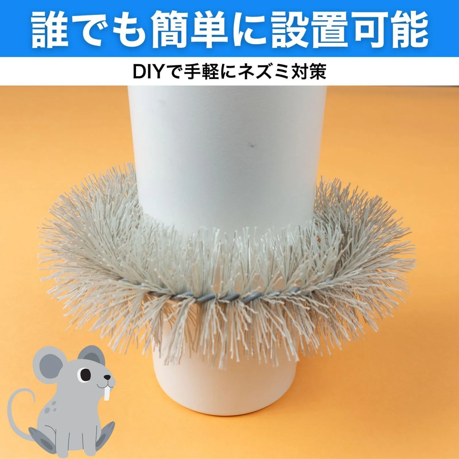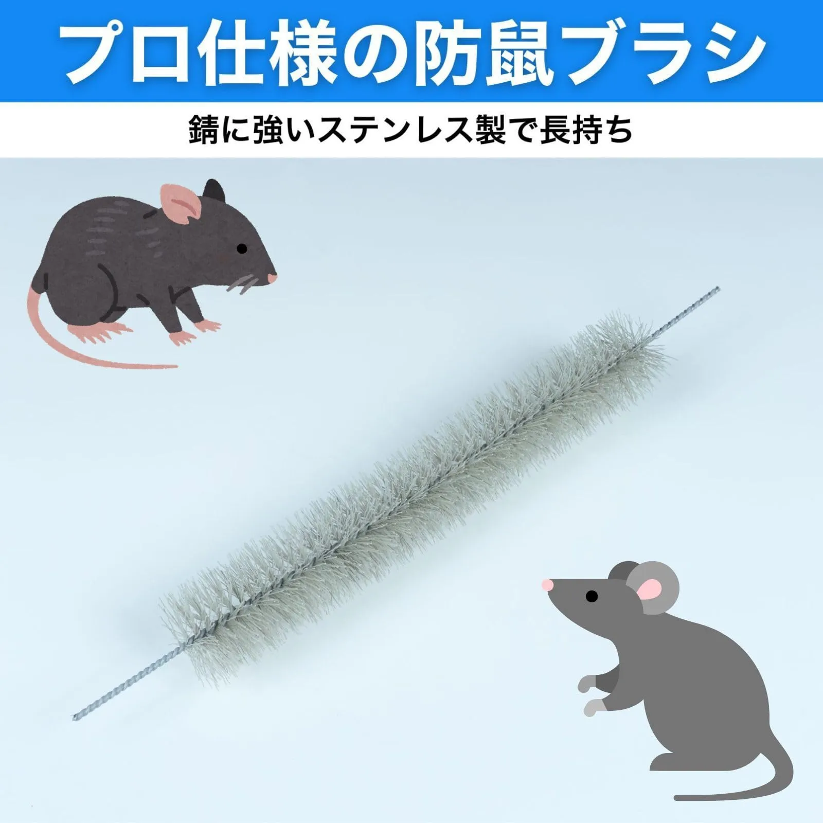 ブラシ」は、扉やシャッターの隙間に設置することで、ネズミなどの侵入を防ぐことができる。また、ブラシの毛がしっかりと詰まっているため、高い防鼠効果が期待できる。物理的に侵入を防ぐ効果は抜群です。✅ブラシの柄には錆びにくく、耐久性に優れた高品質のステンレスを使用しています。湿気の多い場所や屋外でも長期間にわたって使用できるため、頻繁な交換の手間を省き、コスト削減にも貢献してくれます。✅様々な場所の隙間に対応可能です。ドア下、シャッター、配管周りなど、ネズミが侵入しそうなあらゆる場所でご活用いただけます。ブラシの毛の長さは42cmで、幅広いサイズの隙間をカバーできるのが特徴です。✅取り付けは非常に簡単です。ご希望の長さにカットし、付属のビスや両面テープなどで隙間に固定するだけで、すぐにネズミ対策を開始できます。専門業者に頼むことなく、ご自身で設置できるので、手軽にコストを抑えられます。✅