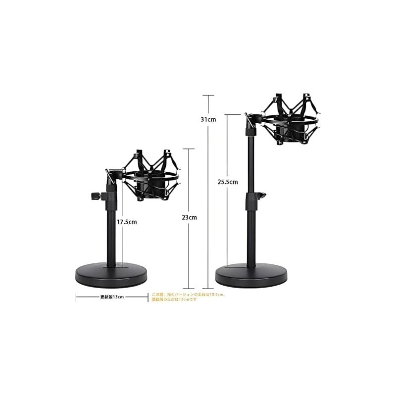 【円型台座、安定性良い】以前のバージョン:直径105mm 最新版:130mmの丸型土台を採用した、卓上タイプのマイクスタンドです。円型台座、非常にシンプルなデザインで安定性も良いです。環境的に選ばず、台の上にはマイクスタンドぐらいしか置かないというケースにオススメです。