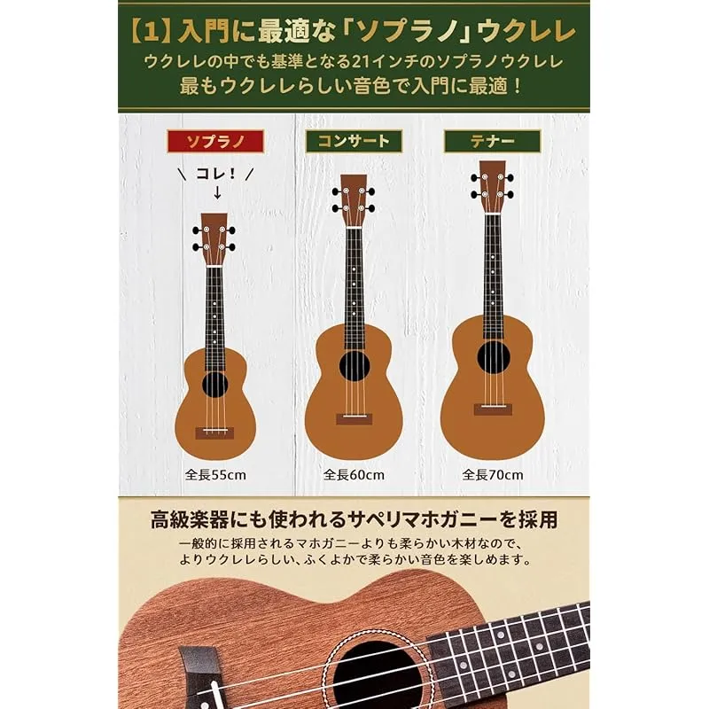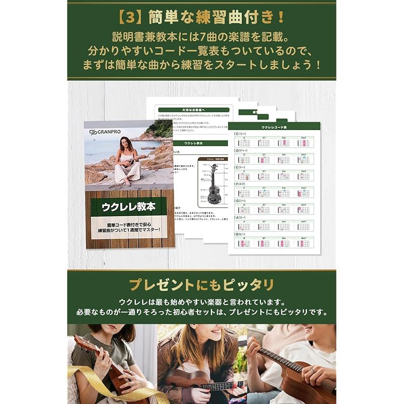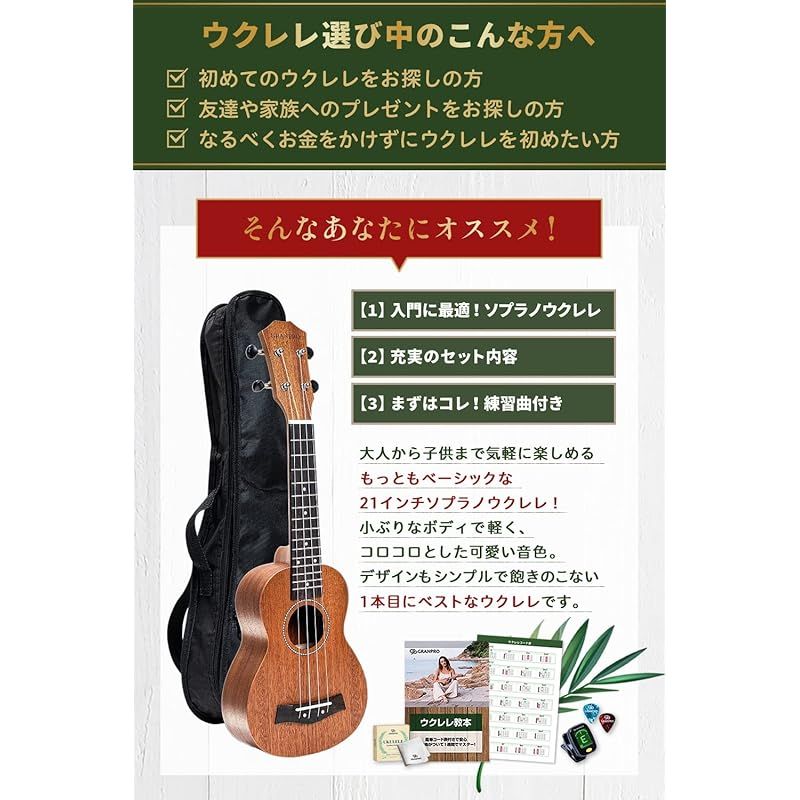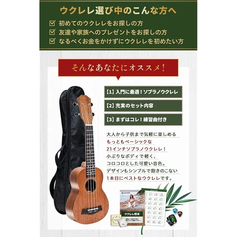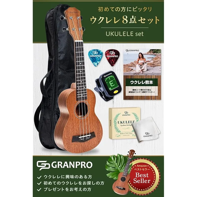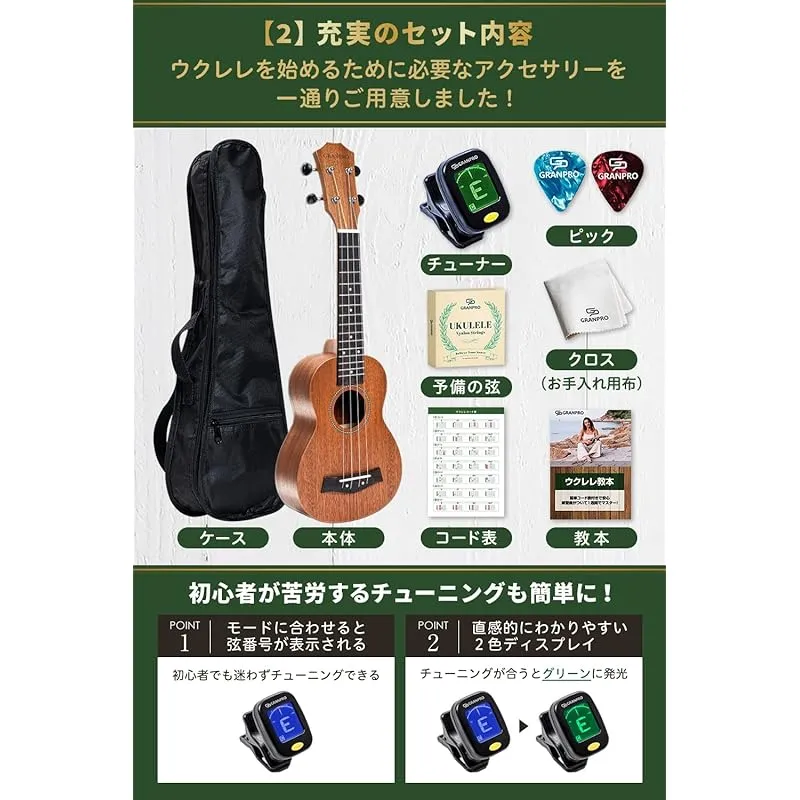 商品名:GRANPRO ソプラノウクレレ 21インチ 初心者8点セット チューナー・弦・ピック・クロス・動画講座付き説明書
