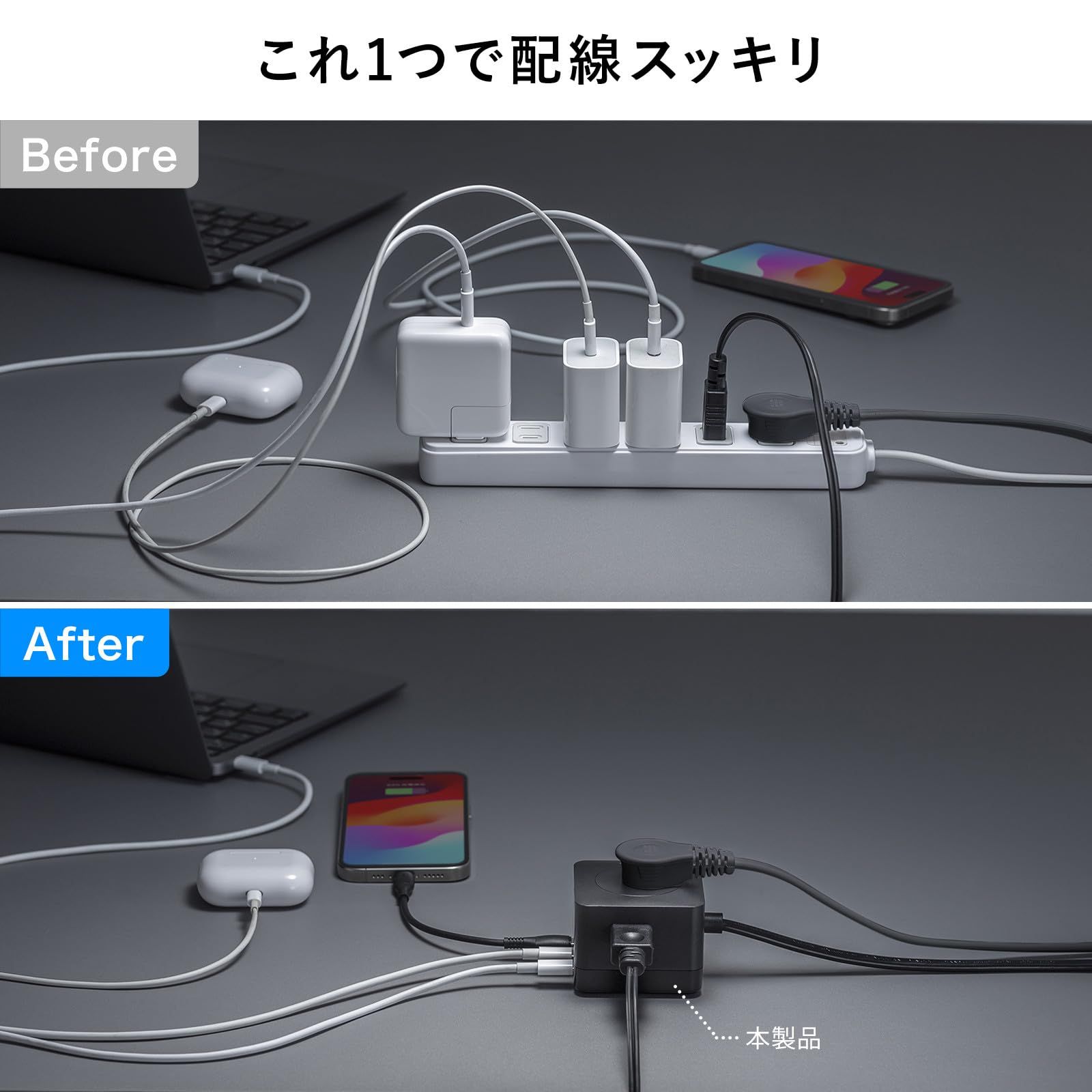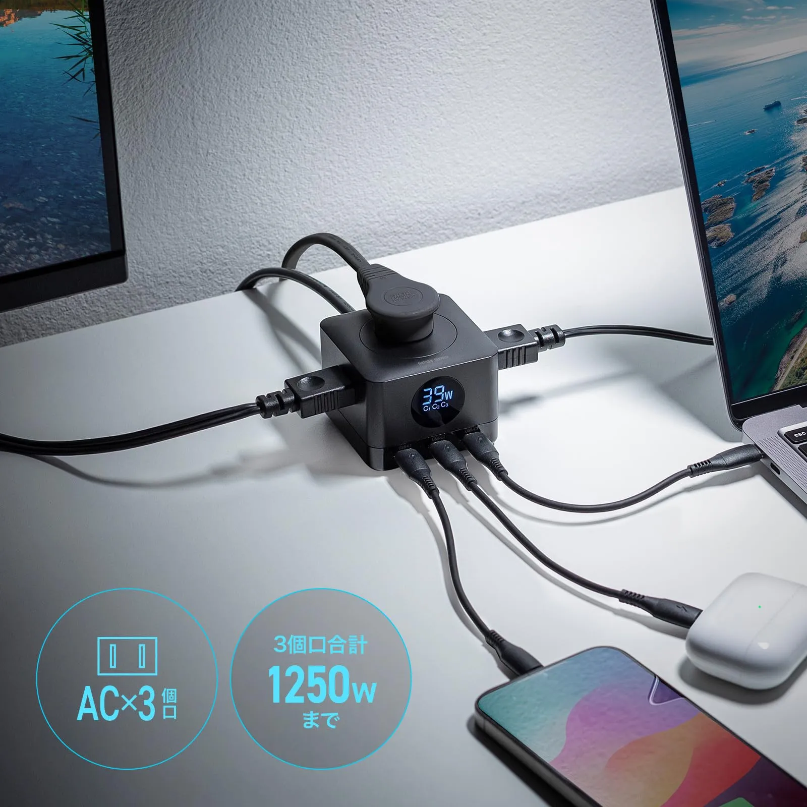 1台でノートパソコンからタブレット・スマートフォンまであらゆるデバイスの充電に対応できる高出力でUSB Type-Cを3ポート搭載した充電機能付きAC3個口仕様の電源タップです。