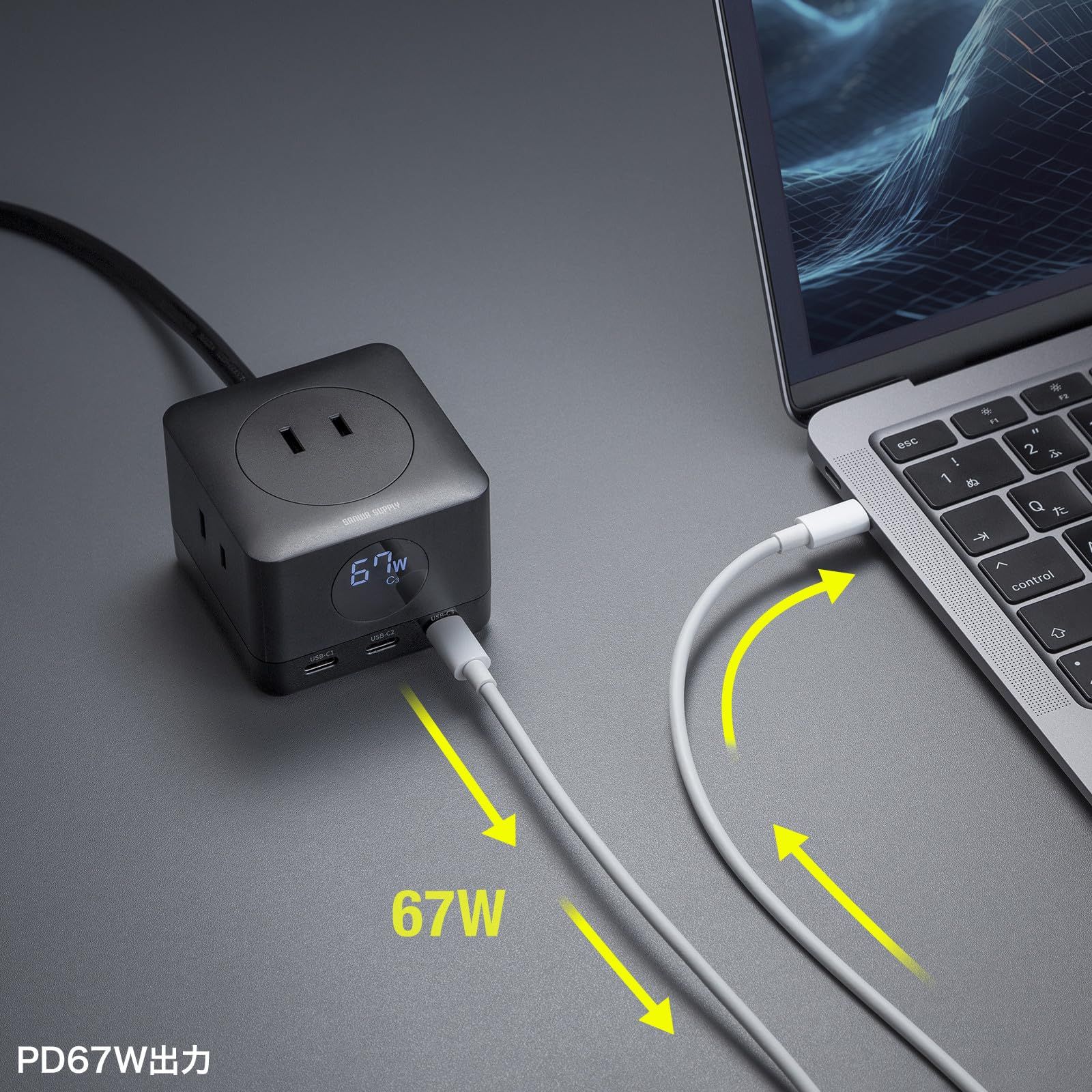 ●USB PD規格(PD3.0)次世代半導体GaN(窒化ガリウム)USB充電機能を搭載し、発熱を抑えた高出力タイプで最大67Wまで対応しています。