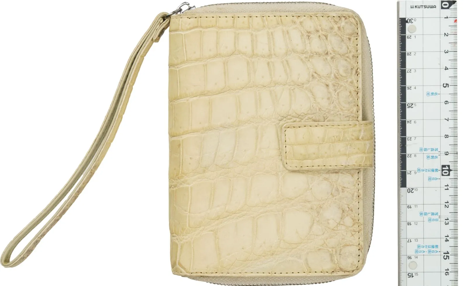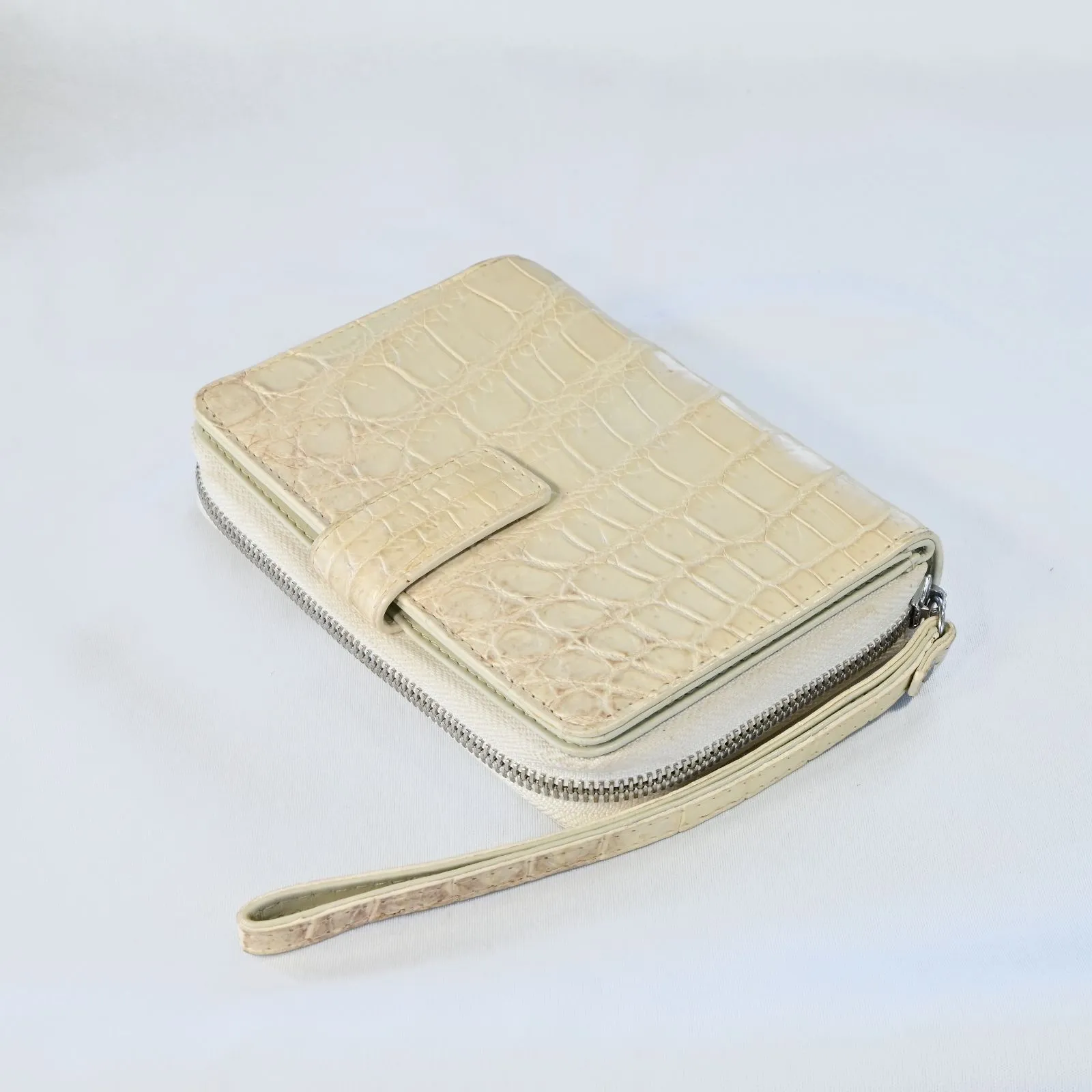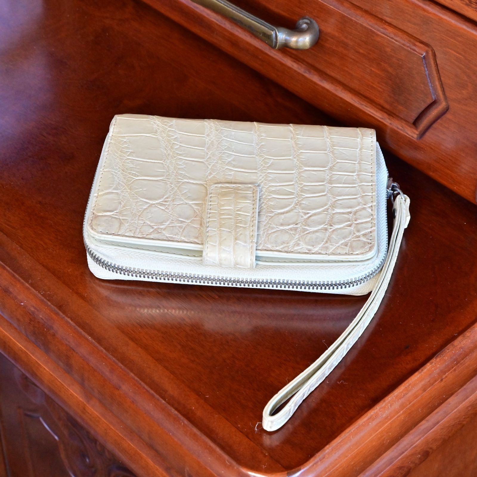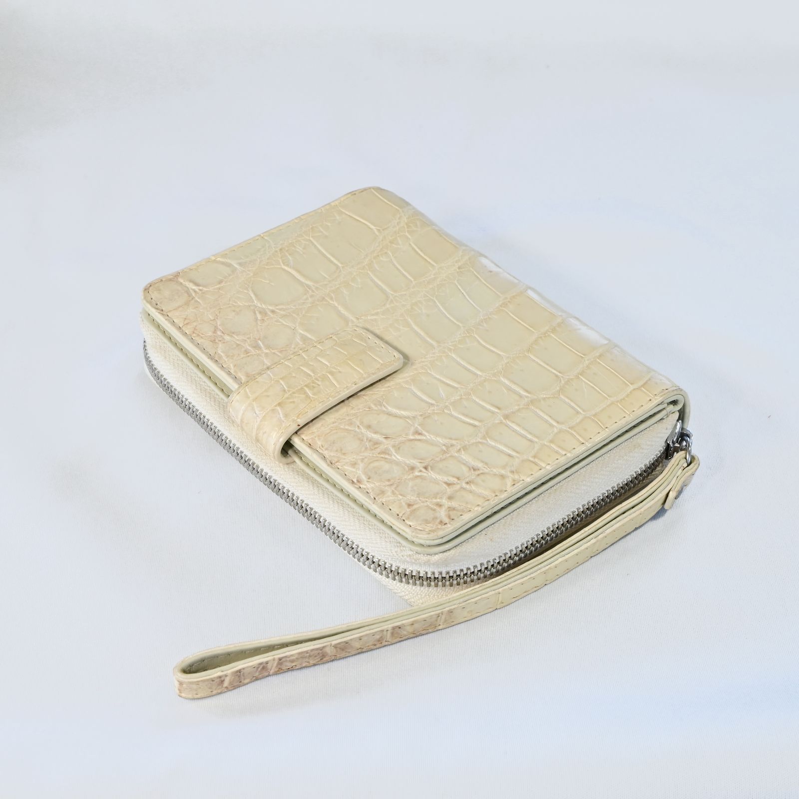 横約15cm、高さ約12cm、マチ約3cmとコンパクトながら、内側には14枚分のカードポケットを含む複数のコンパートメントを備え、現金やカード、小物類を整理して収納可能。外ポケットは設けず、シンプルなデザインでクロコダイルの美しい表情を最大限に活かしています。開閉はマグネットボタン式でスムーズかつ安心。さらに約18cmのストラップ付きで、手首に掛けてリストレットとして使うこともでき、バッグの中で迷子になりがちな小物をスマートに持ち運べます。