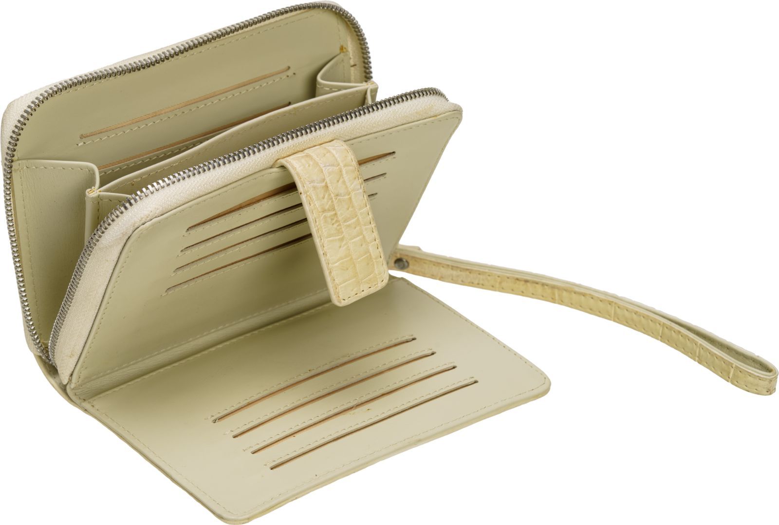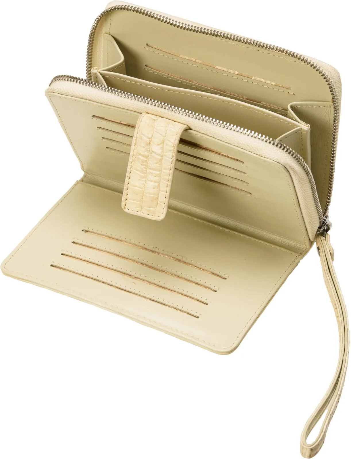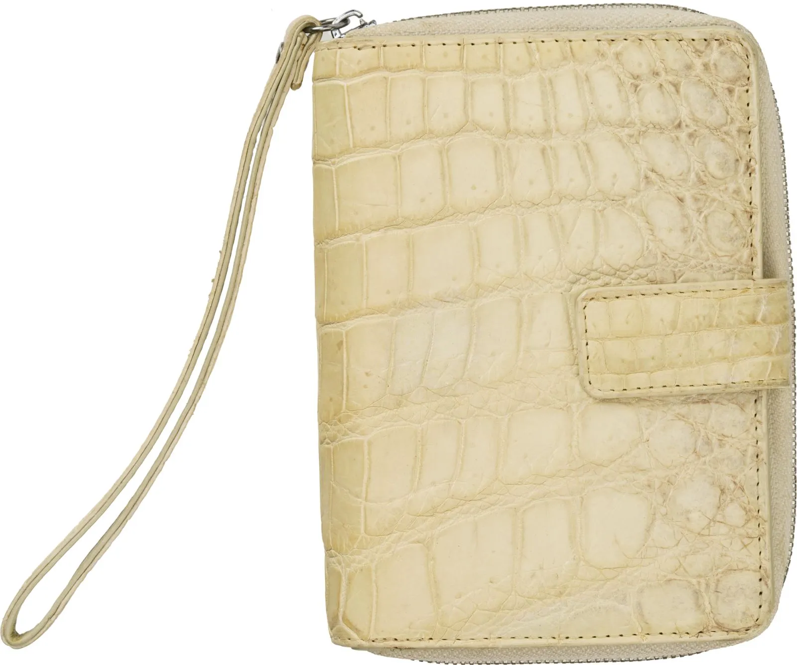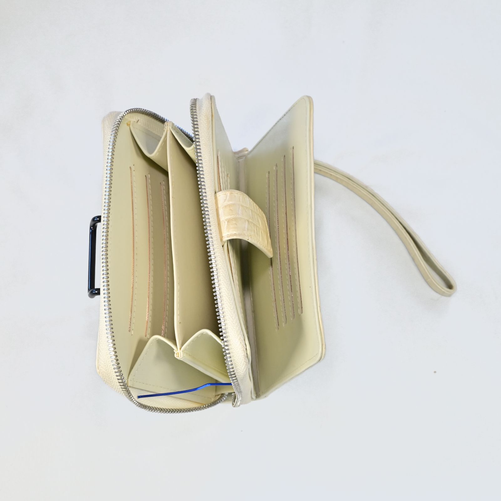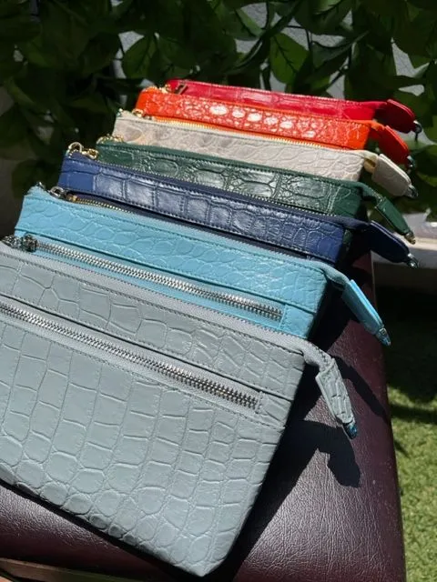 横約15cm、高さ約12cm、マチ約3cmとコンパクトながら、内側には14枚分のカードポケットを含む複数のコンパートメントを備え、現金やカード、小物類を整理して収納可能。外ポケットは設けず、シンプルなデザインでクロコダイルの美しい表情を最大限に活かしています。開閉はマグネットボタン式でスムーズかつ安心。さらに約18cmのストラップ付きで、手首に掛けてリストレットとして使うこともでき、バッグの中で迷子になりがちな小物をスマートに持ち運べます。