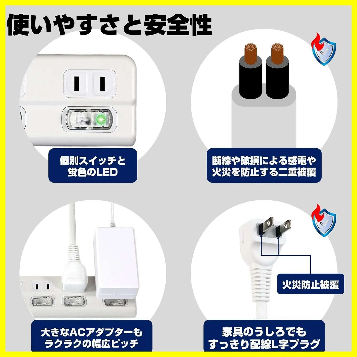 商品詳細・定格:AC125V 15A ・合計:1500Wまで ・使用温度範囲:-10℃~40℃ ・コード長:2m ・口数:4個口 ・屋内専用