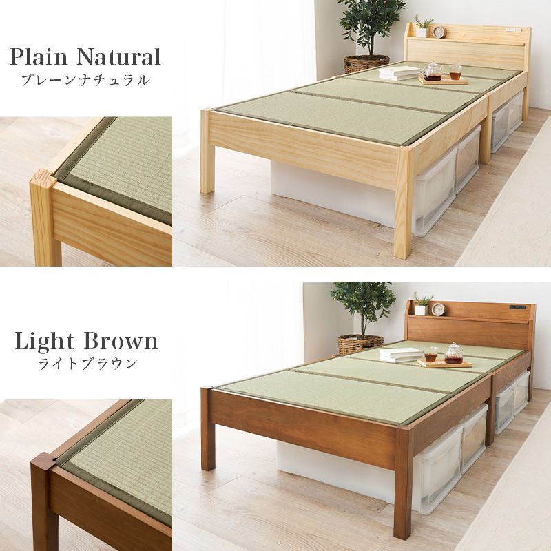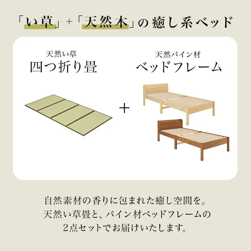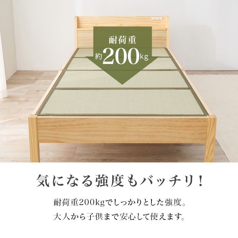 ネジなし、工具不要で簡単組立。爽やかな天然い草を使用した畳マットをすのこベッドに合わせました。スマートフォンなどの充電やライトの取り付けに便利な宮棚とコンセント付き