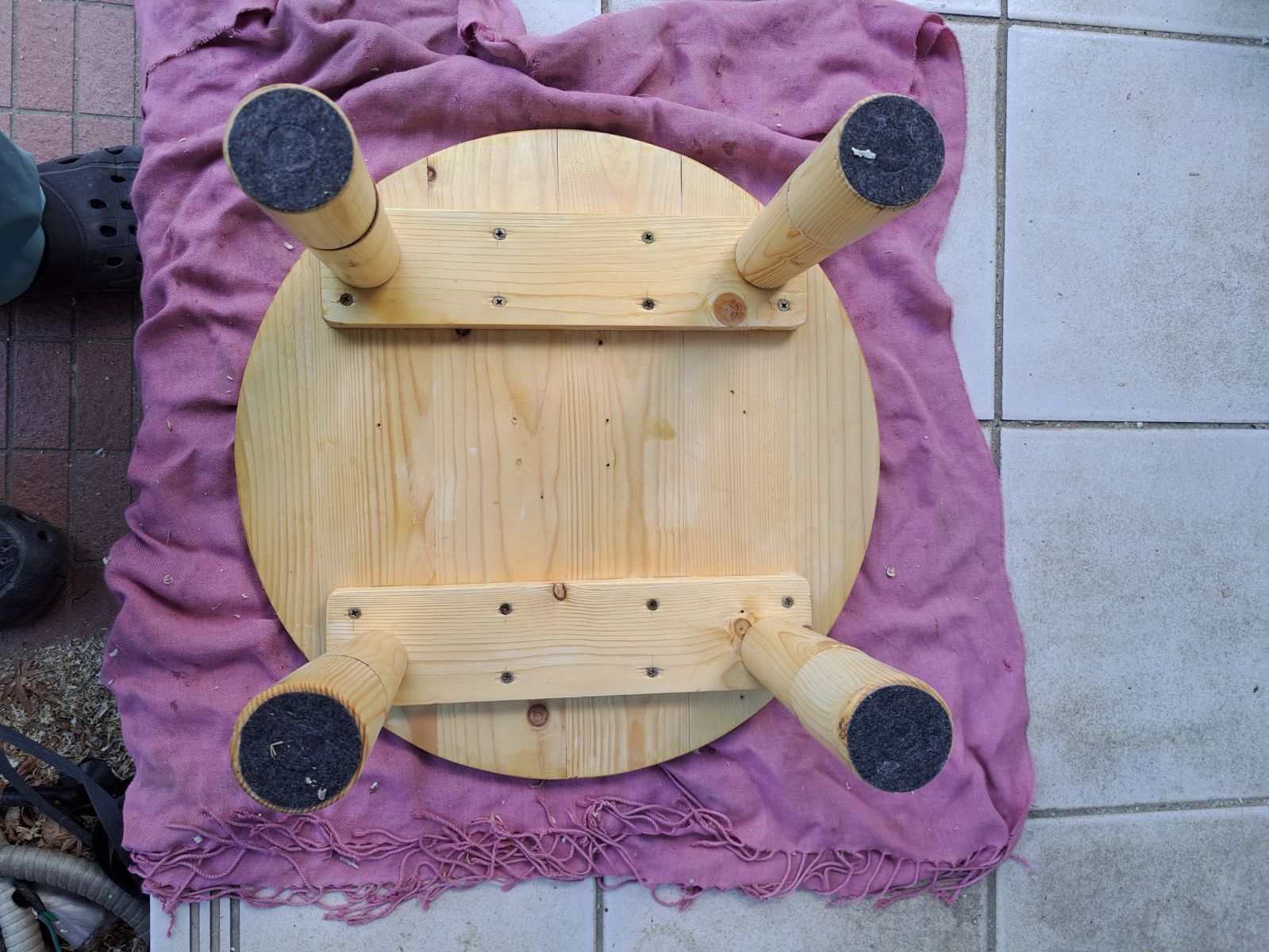 足はホームセンターで既製品のB級品として安く売られていたもので、加工精度が悪く取付ボルトの芯が出てなく多少斜めに取りつく場合が有ります。 又ガタツキと傷防止の対策としてフェルトが張られていますが、それでもがたつくようであれば、フェルトの重ね張り等で対策してください。 ※発送時は梱包サイズの関係で足は取り外して梱包しますので、購入者様の方でねじ込んでください。