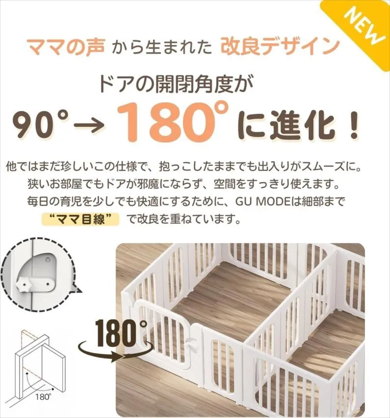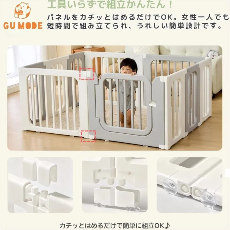 ◆お子さまの遊ぶスペースをやさしく囲い、安全なエリアを確保できます。キッチンまわりや階段付近など、近づいてほしくない場所にはベビーフェンスとして設置すれば、危険なエリアをしっかりガードできます。さらに、マットや布団と組み合わせれば簡易ベビーベッドとしても活躍し、お昼寝タイムも安心して見守れます。本体には、丈夫で安全性の高い高密度ポリエチレン(HDPE)を採用。毎日使うアイテムだからこそ、「安心感」にこだわりました。