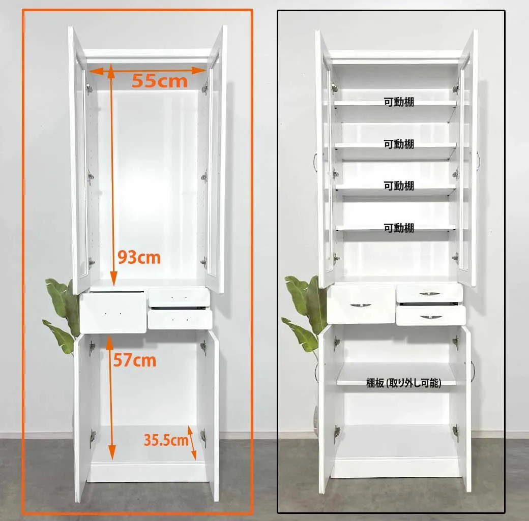 ■特徴 :この60DBハイグロスシートダイニングボードは、モダンで洗練されたデザインが魅力です。ホワイトカラーが明るい印象を与え、どんなインテリアにもマッチします。広々とした収納スペースを確保しており、食器はもちろん、調理器具やキッチン雑貨をしっかり整理整頓できます。ドア部分はハイグロス仕上げで、汚れがつきにくく、簡単にお手入れができるのも嬉しいポイントです。