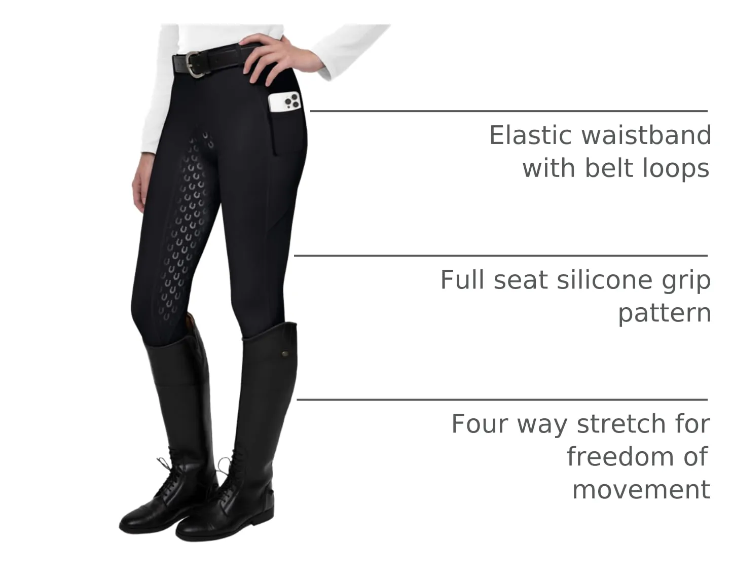 この乗馬タイツは、ベルトループ付きの伸縮性ウエストバンドが特徴で、モダンな外観を提供します。 さらにグリップ力を高める楽しいパターンのシリコン