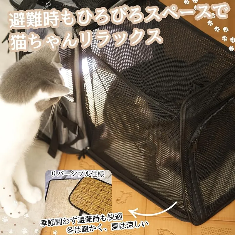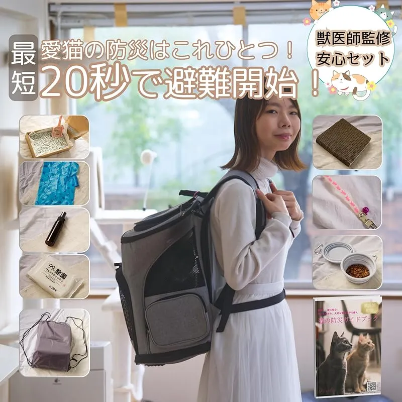 【獣医師監修】 猫用防災セット 21点 リュック兼ケージ 拡張 キャリー 防災ガイドブック付 トイレ バッグ エサ おやつ 猫砂 災害 ペット 避難