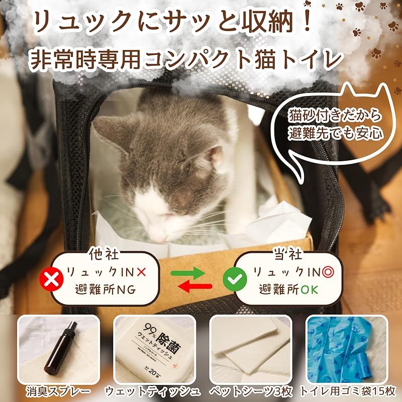??? セット内容:拡張可能リュック、つめとぎ、折り畳みトイレセット(トイレ、スコップ)、猫砂、ペットシーツ、トイレ用ゴミ袋、ウェットティッシュ、消臭・除菌スプレー、折り畳みボウル(2個)、フード(ドライ1個+ウェット2個)、おやつ(4種)、蓄光首輪、ナップサック、カラビナ、防災ガイドブック