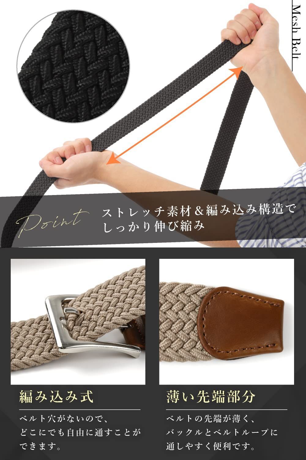 【穴なし無段階フィット】 ベルト メンズ メッシュベルト 編み込み 伸縮ベルト ゴム 伸びる カジュアル ビジネス 紳士 レザー (黒)