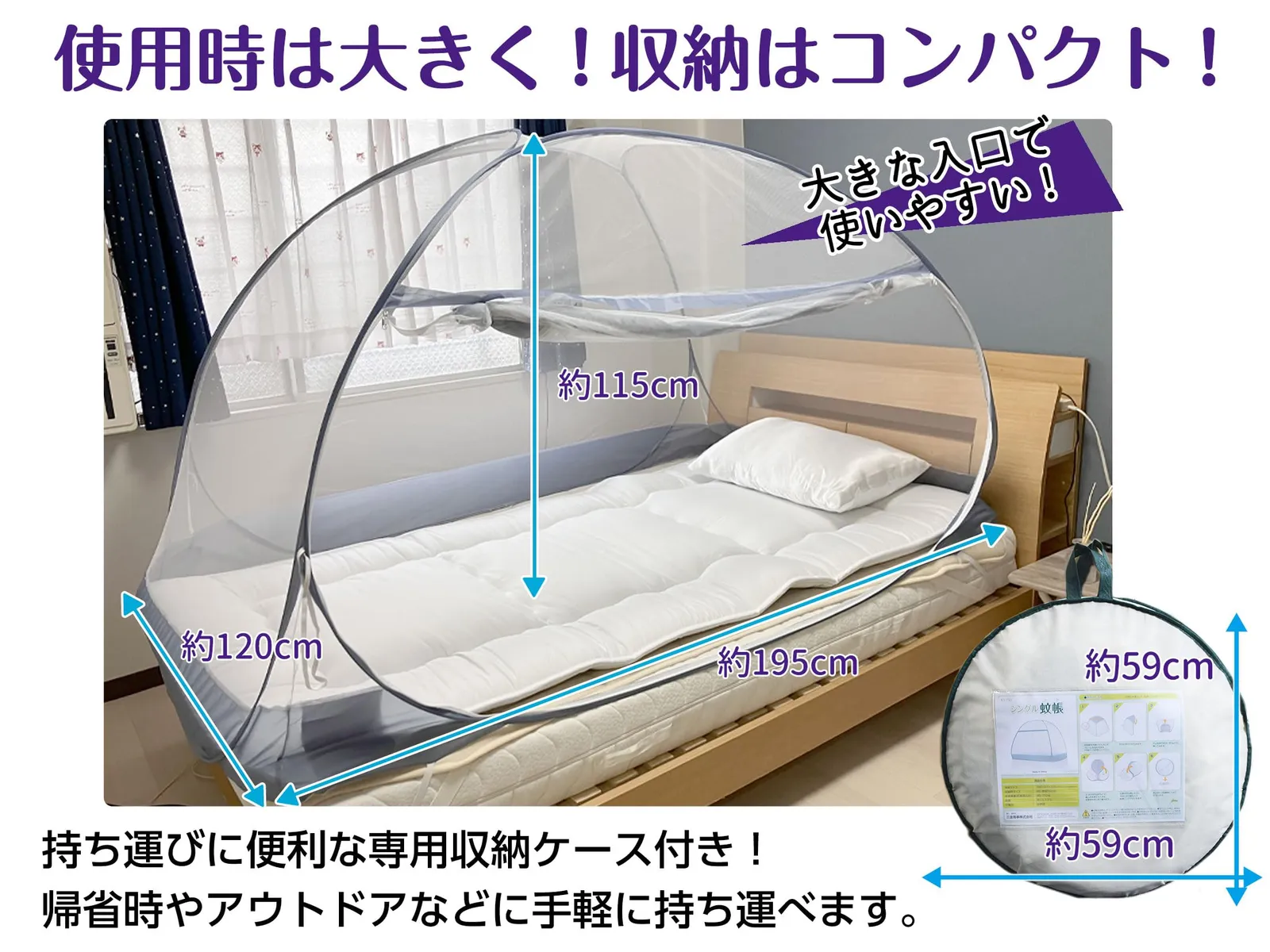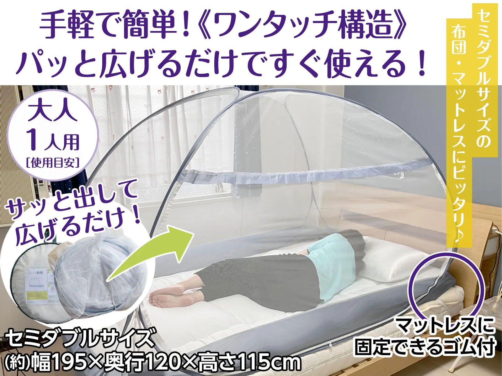 ● ベッドの上に設置できるセミダブルサイズ 必要最小限の省スペース蚊帳!一人暮らしの方に特におススメのサイズ感です。 マットレス固定用ゴム付き!
