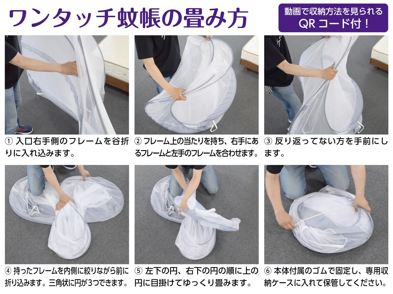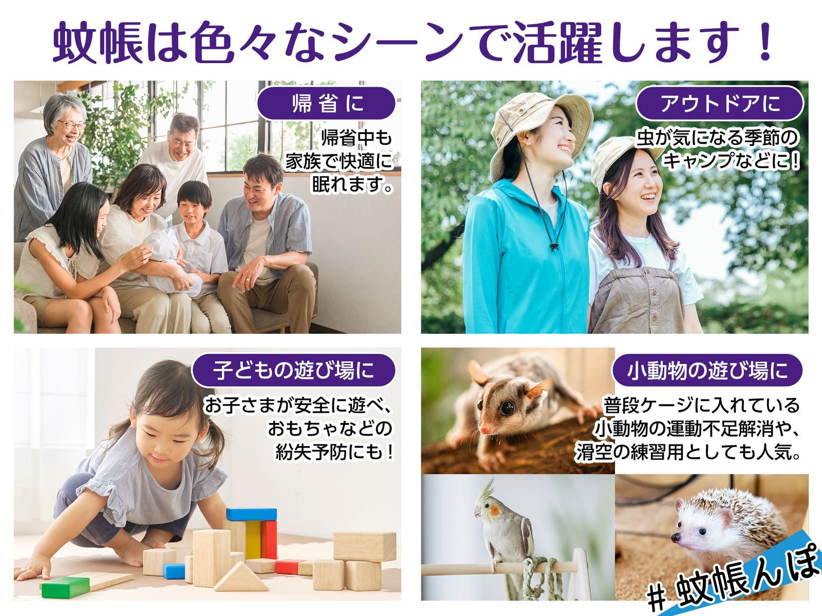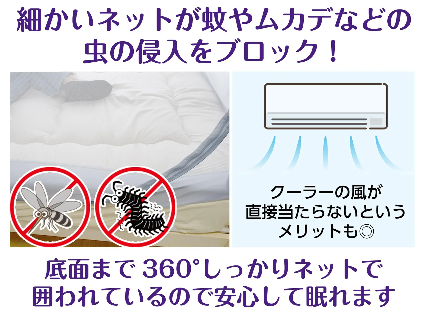 ● 不安を解消!安心した睡眠 全体で囲まれた細かいネットが蚊やムカデの侵入をブロック! ネットは通気性が良く、中は熱がこもりません!