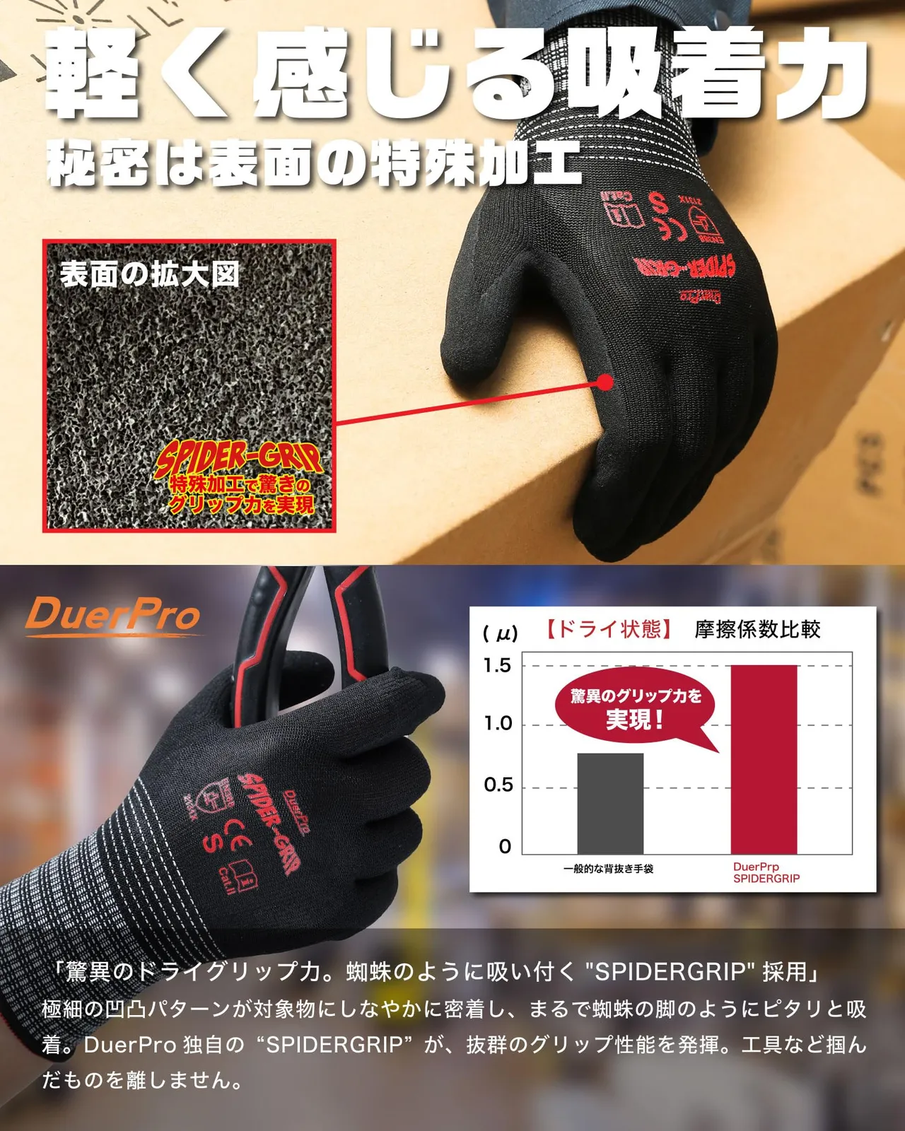 【驚異の吸着力&進化したフィット感!スマホ対応作業用手袋】 DuerProの作業用手袋は、特殊コーティング「SPIDER-GRIP」により吸い付くような驚異のグリップ力を発揮。滑り止め効果で荷物や工具をしっかり保持し、引越し・倉庫・運送・建築現場など幅広く活躍。重い物を持つ際に軽く感じる程の吸着力を発揮します。さらに高ゲージ編みに進化し、手の形にぴったりフィット。ズレにくく力を伝えやすいため作業効率が向上します。スマホ対応仕様で、作業中も手袋を外さずにスマートフォン操作が可能。プロも認める高機能な滑り止め作業用手袋です。