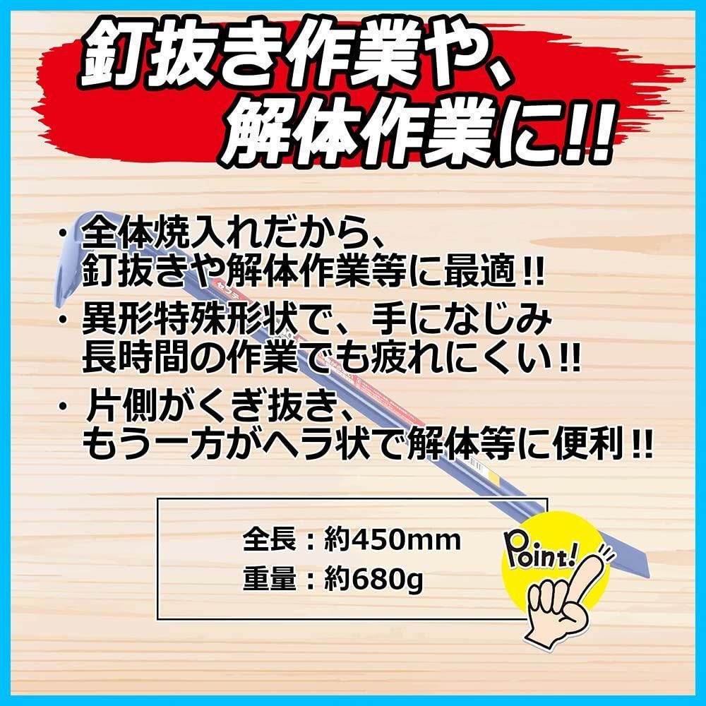 ・片側がくぎ抜き、もう一方がヘラ状になっており解体等に便利
