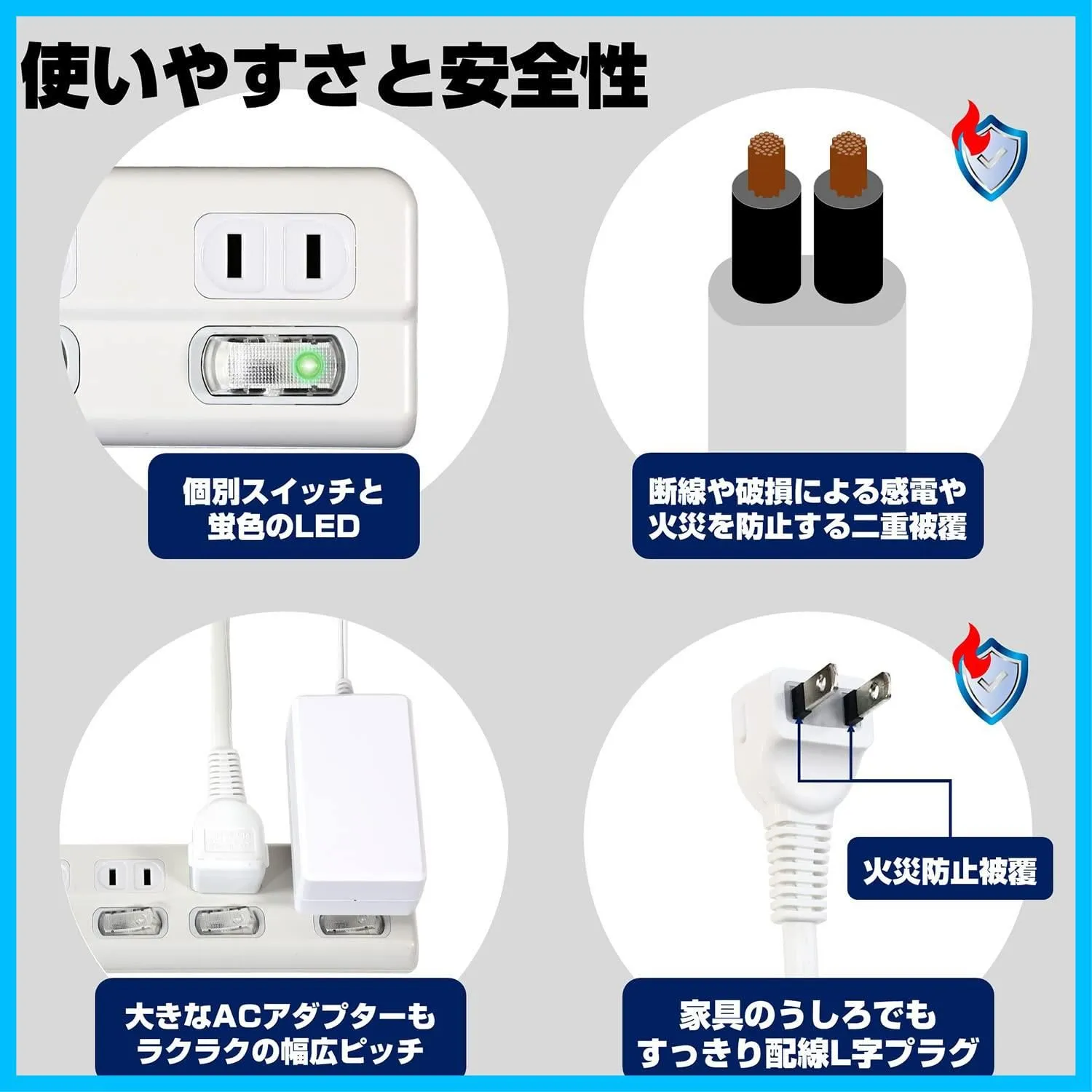 商品詳細・定格:AC125V 15A ・合計:1500Wまで ・使用温度範囲:-10℃~40℃ ・コード長:2m ・口数:4個口 ・屋内専用