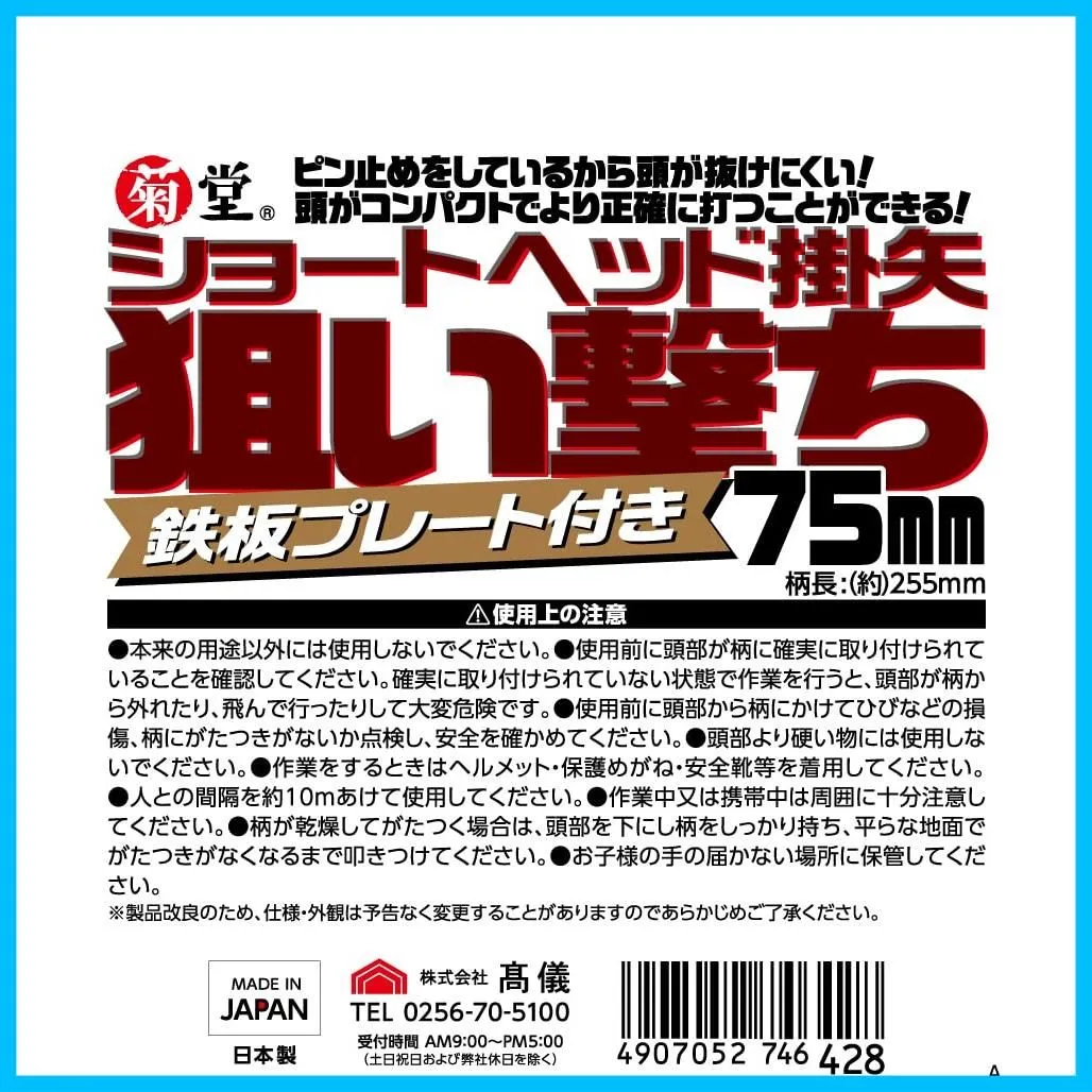 高儀Takagi) 菊堂 ショートヘッド掛矢 狙い撃ち プレート付 75mm