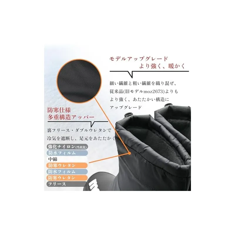 本体撥水加工に加え、接地面より4cm6時間防水仕様も追加し、冬の冷たい水から足をガード。