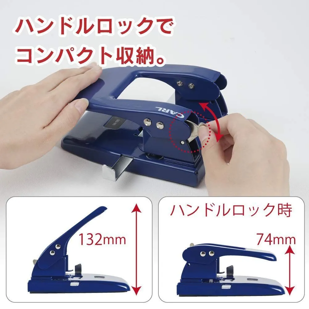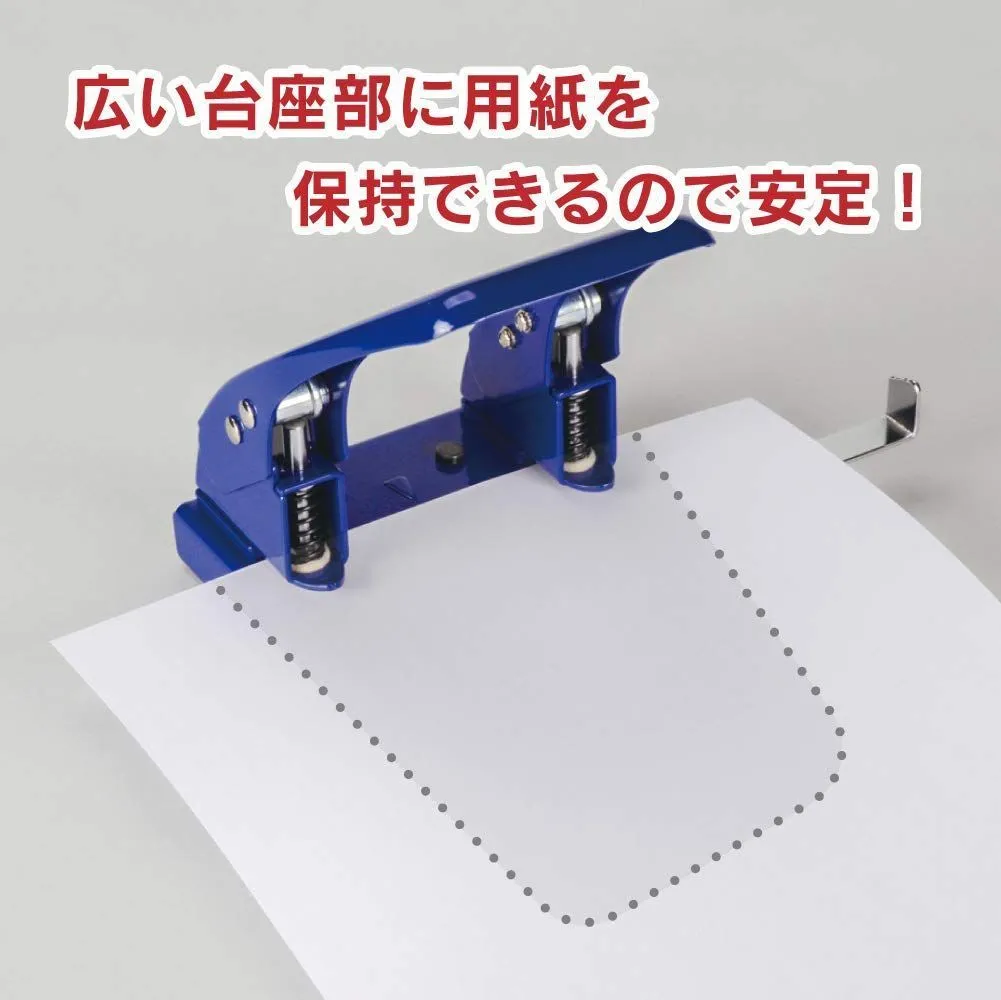 広い紙台と丈夫な金属製サイドゲージにより、用紙が垂れにくく用紙の中央合わせが簡単。1度に大量穴あけが可能な2穴パンチ。