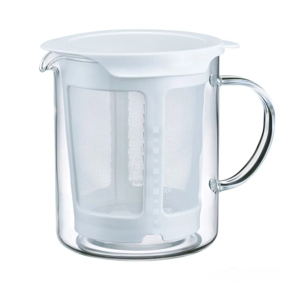 【商品詳細】 本体サイズ:幅15.4×奥行11.5×高13.0cm、本体重量:約340g、実用容量:600mL、本体材質:本体/耐熱ガラス、フタ・ストレーナーフレーム/ポリプロピレン、ストレーナーメッシュ/ポリエステル、日本製