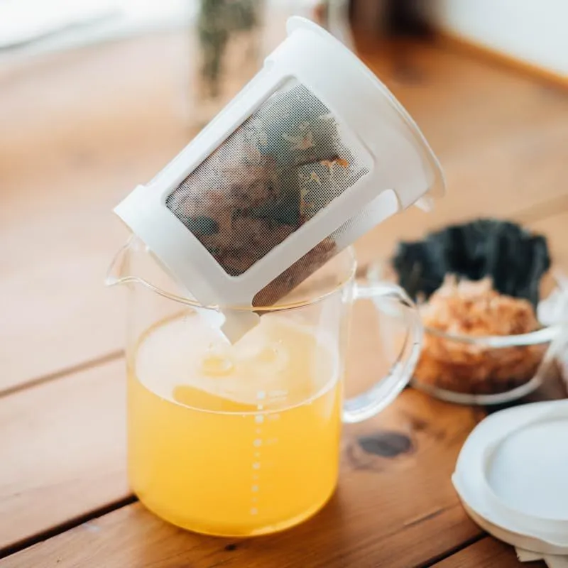 【電子レンジでだし作り】 電子レンジで手軽にだしがとれるポット。ポットの底まで届く大きなストレーナーで、だしをしっかり抽出します。