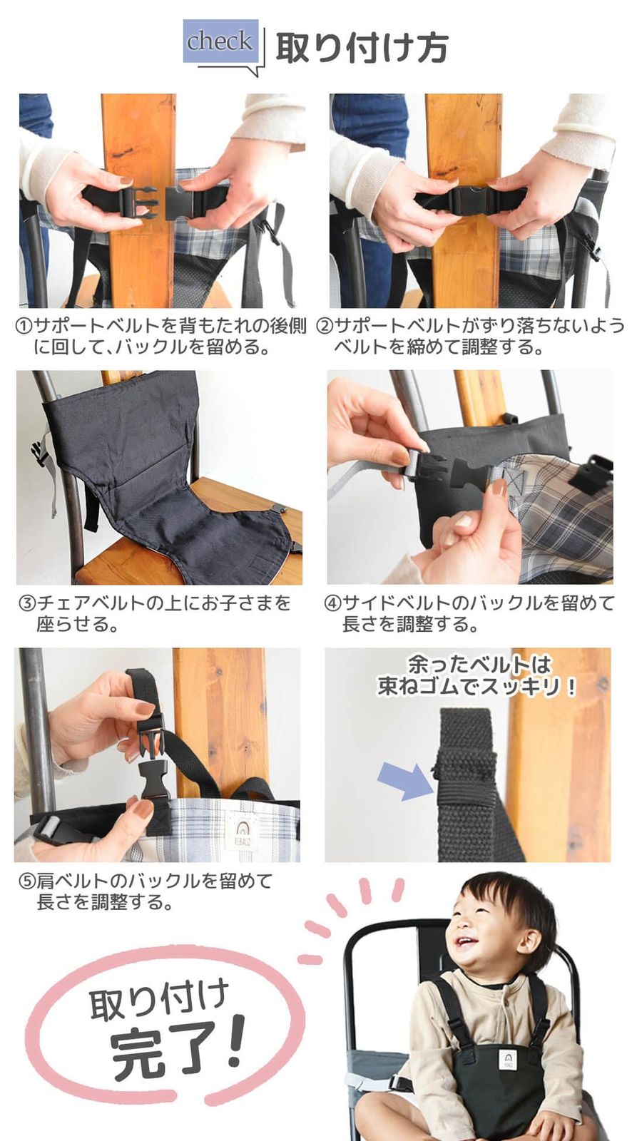 1.サポートベルトをイスの背もたれや大人のウエスト部分に回し、バックルを留めてゆるみのないように調整します。