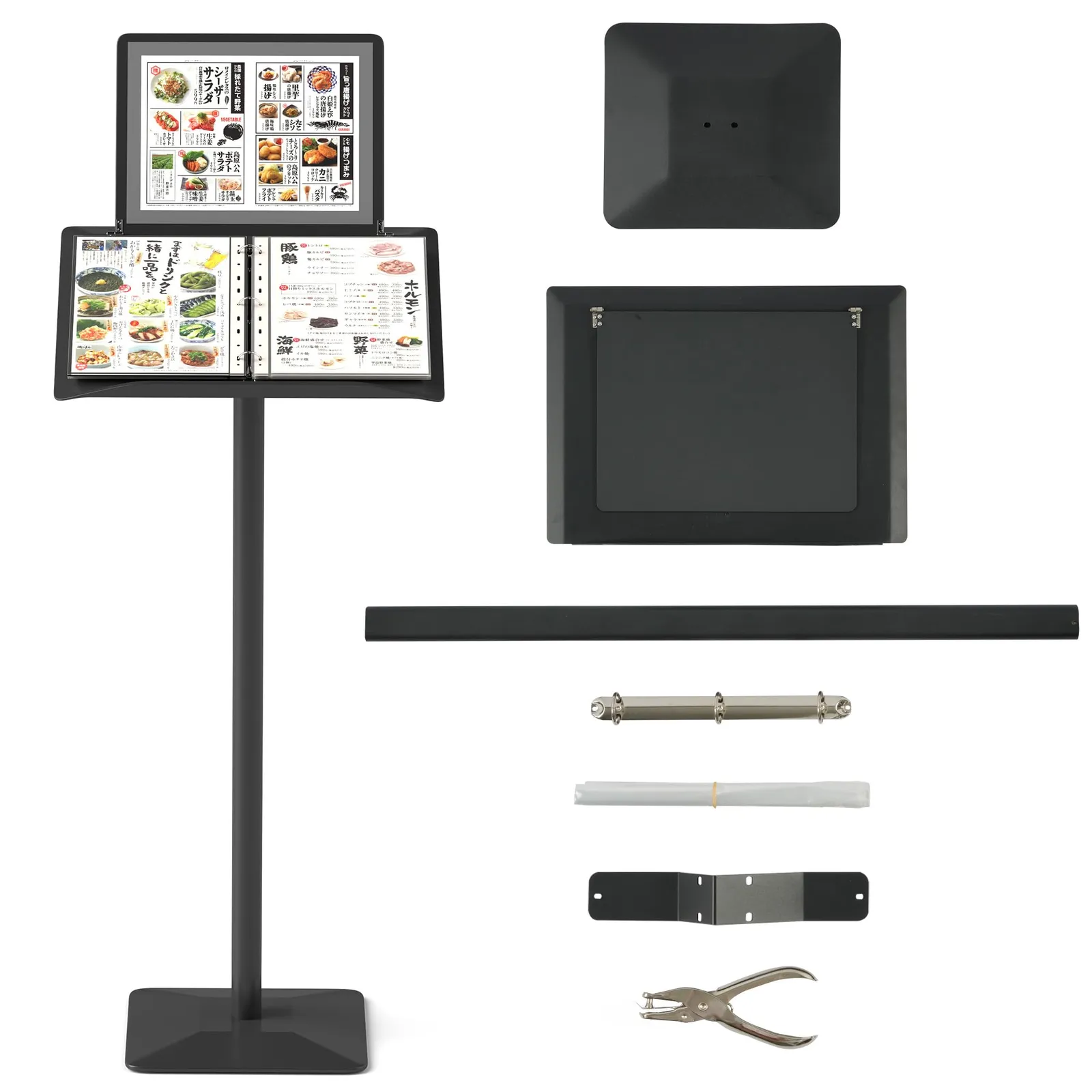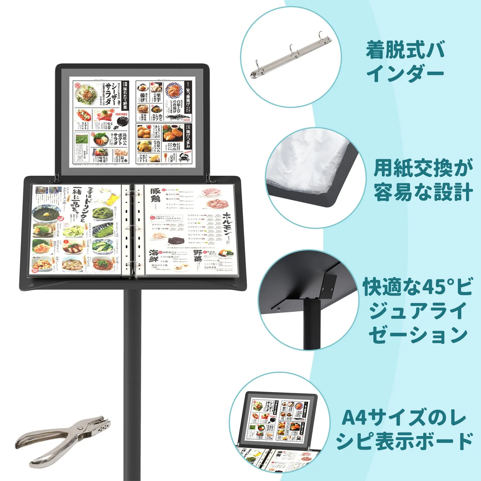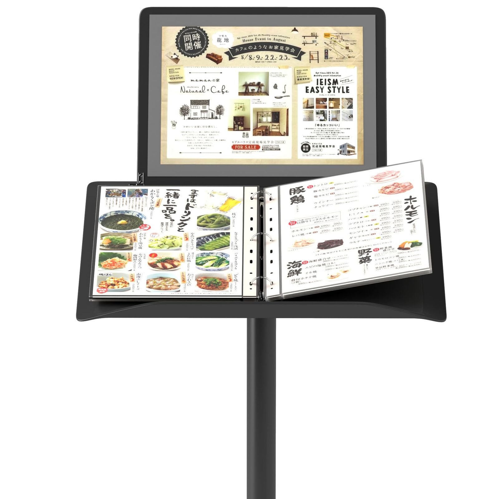 2種類のディスプレイオプシ: スタンドボード ョン A3サイズ以上のポスターを掲示できるフロアスタンドと、A4サイズのメニューページを複数掲示できる取り外し可能なA4サイズ3リングバインダー。アンチグレアHD PVCフィルムがポスターを覆い、ホコリ、指紋、紫外線、雨からポスターを守り、鮮明なディスプレイを実現します