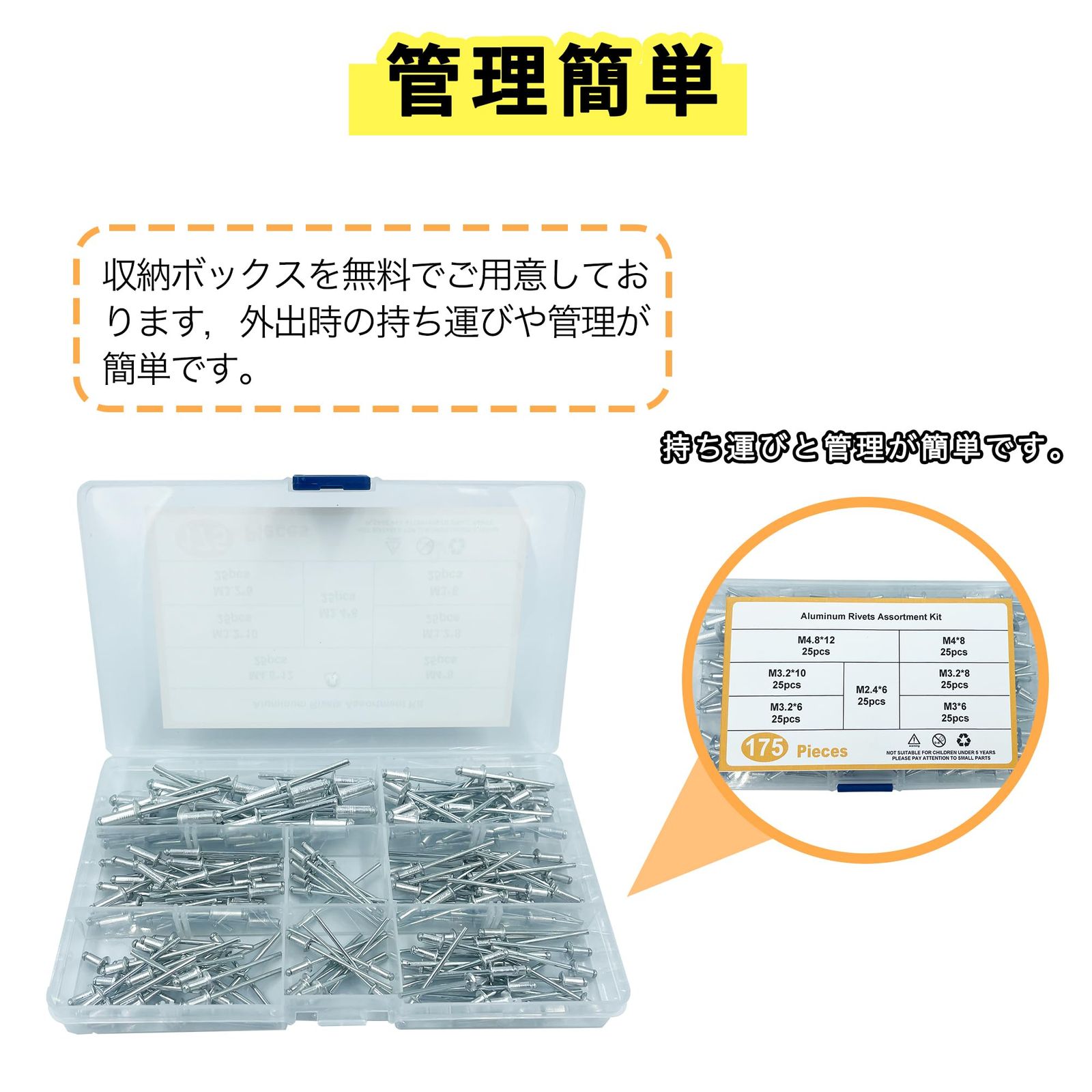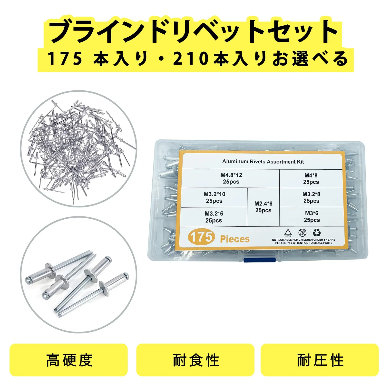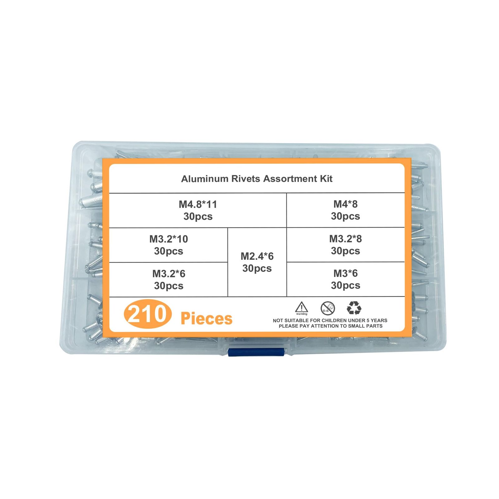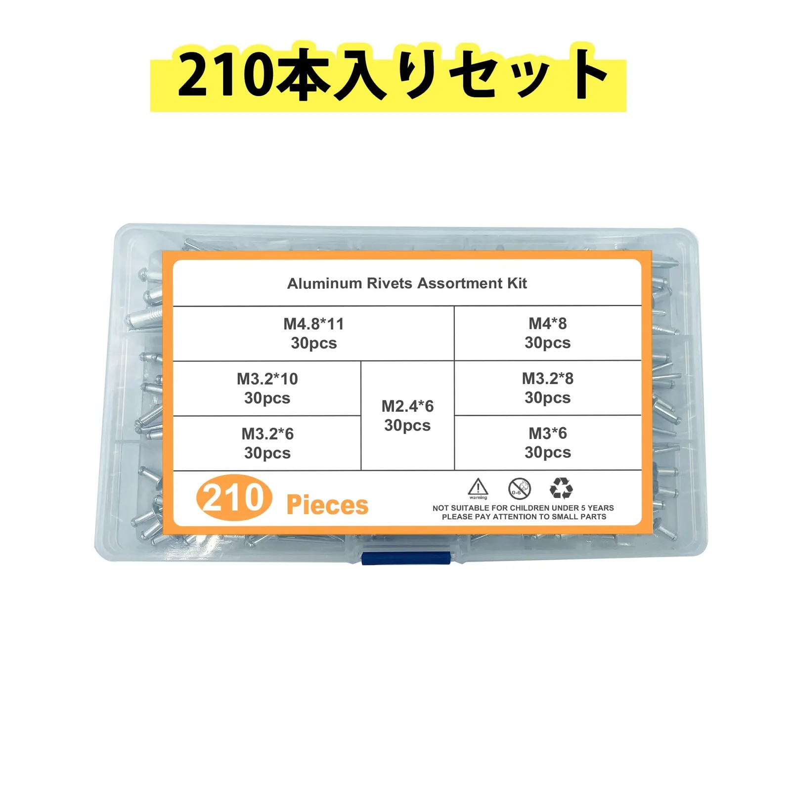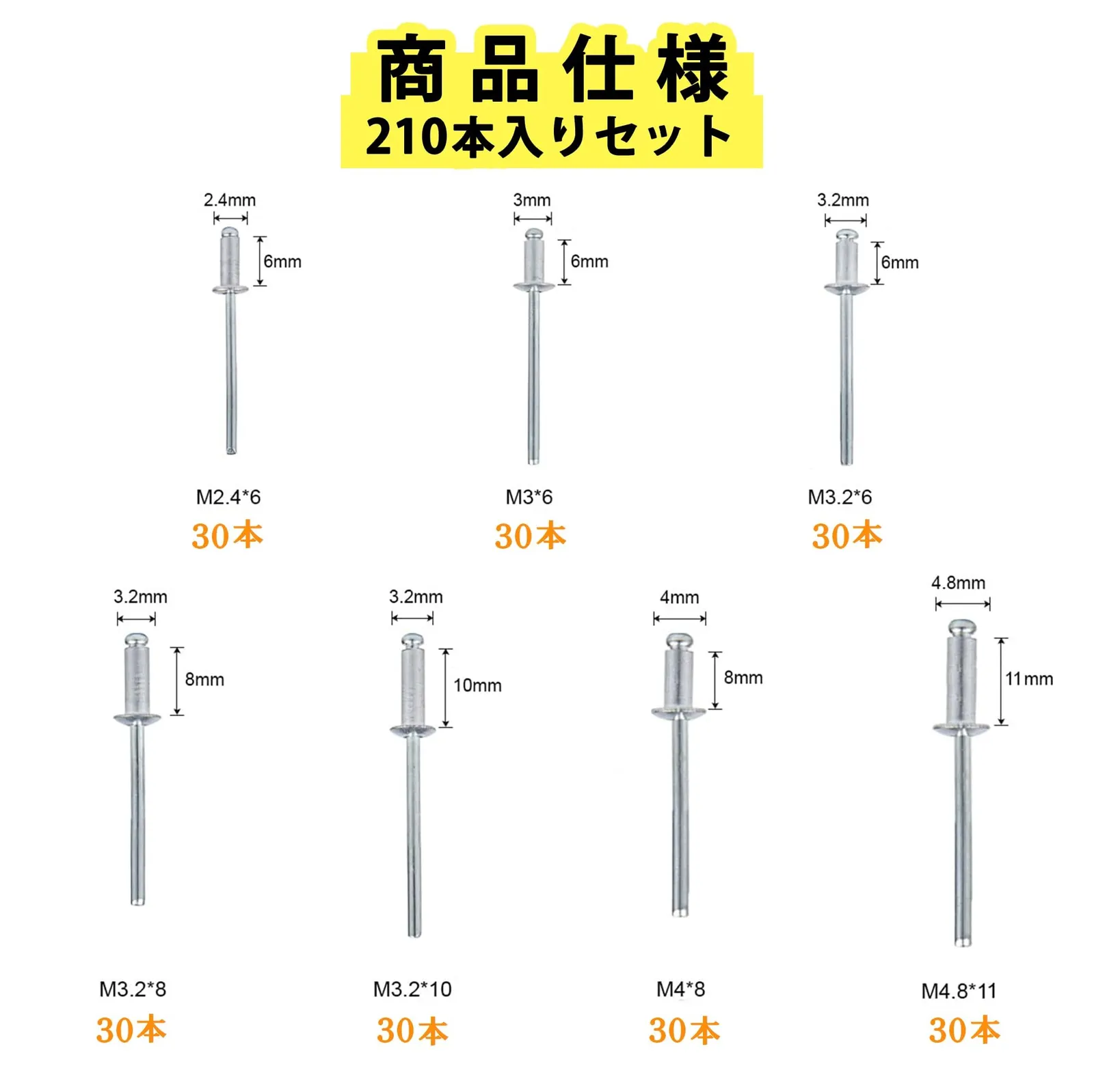 ブラインドリベット アルミニウム 耐食 耐圧 ブラインドリベットファスナー リベットファスナーキット M2.4*6 M3*6 M3.2*6 M3.2*10 M3.2*8 M4*8 M4.8*12 M4.8*11 (210個入り(7種類 各30))