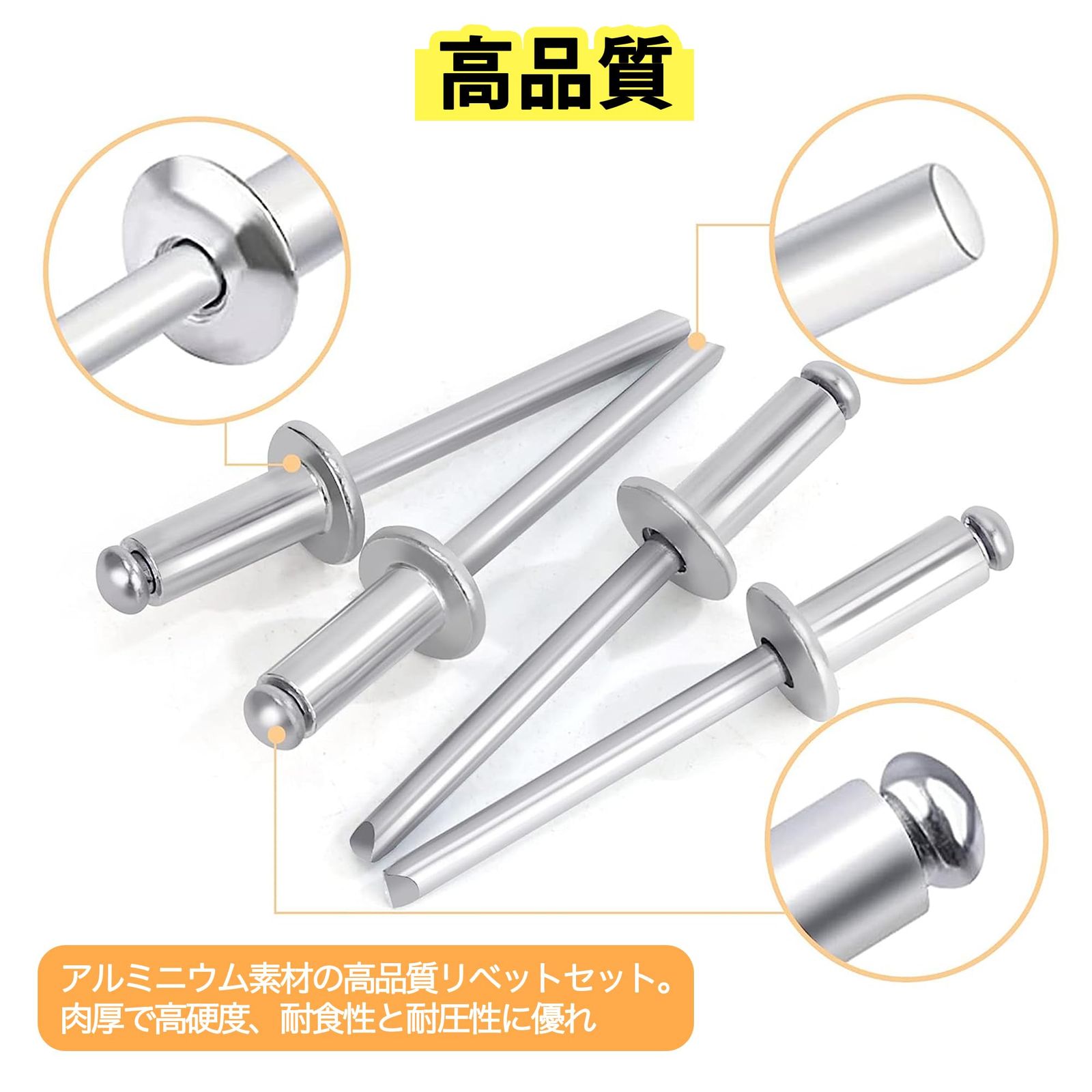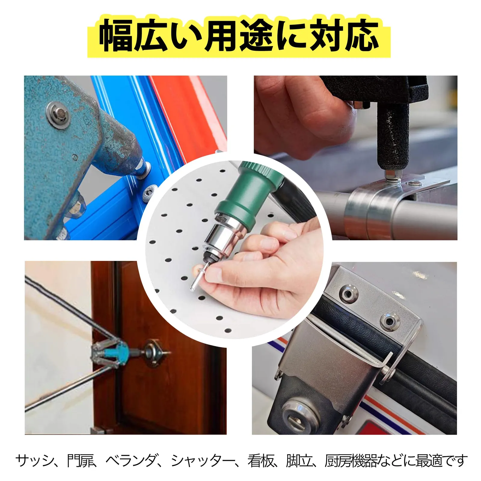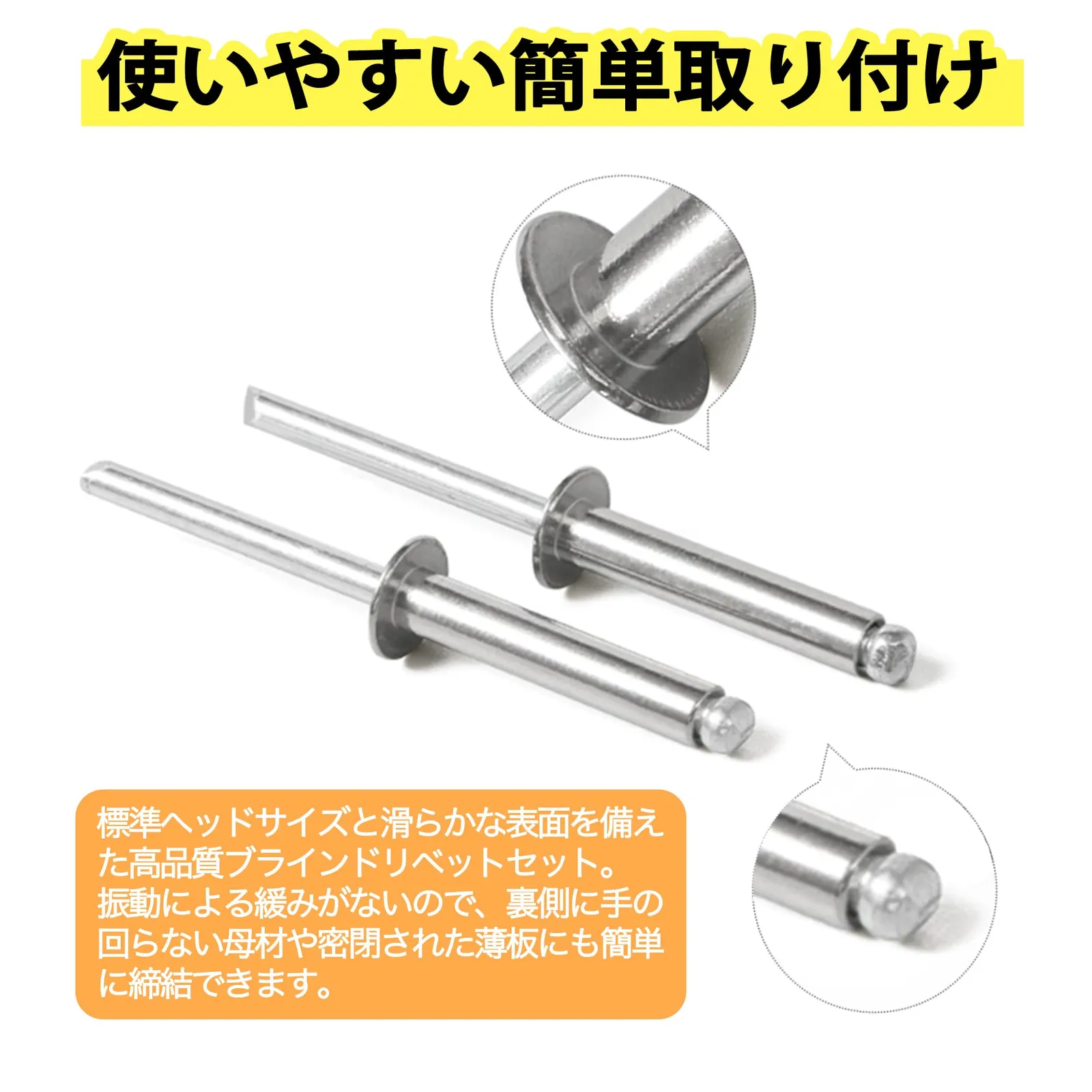 【使いやすい簡単取り付け】 標準ヘッドサイズと滑らかな表面を備えた高品質ブラインドリベットセット。振動による緩みがないので、裏側に手の回らない母材や密閉された薄板にも簡単に締結できます。