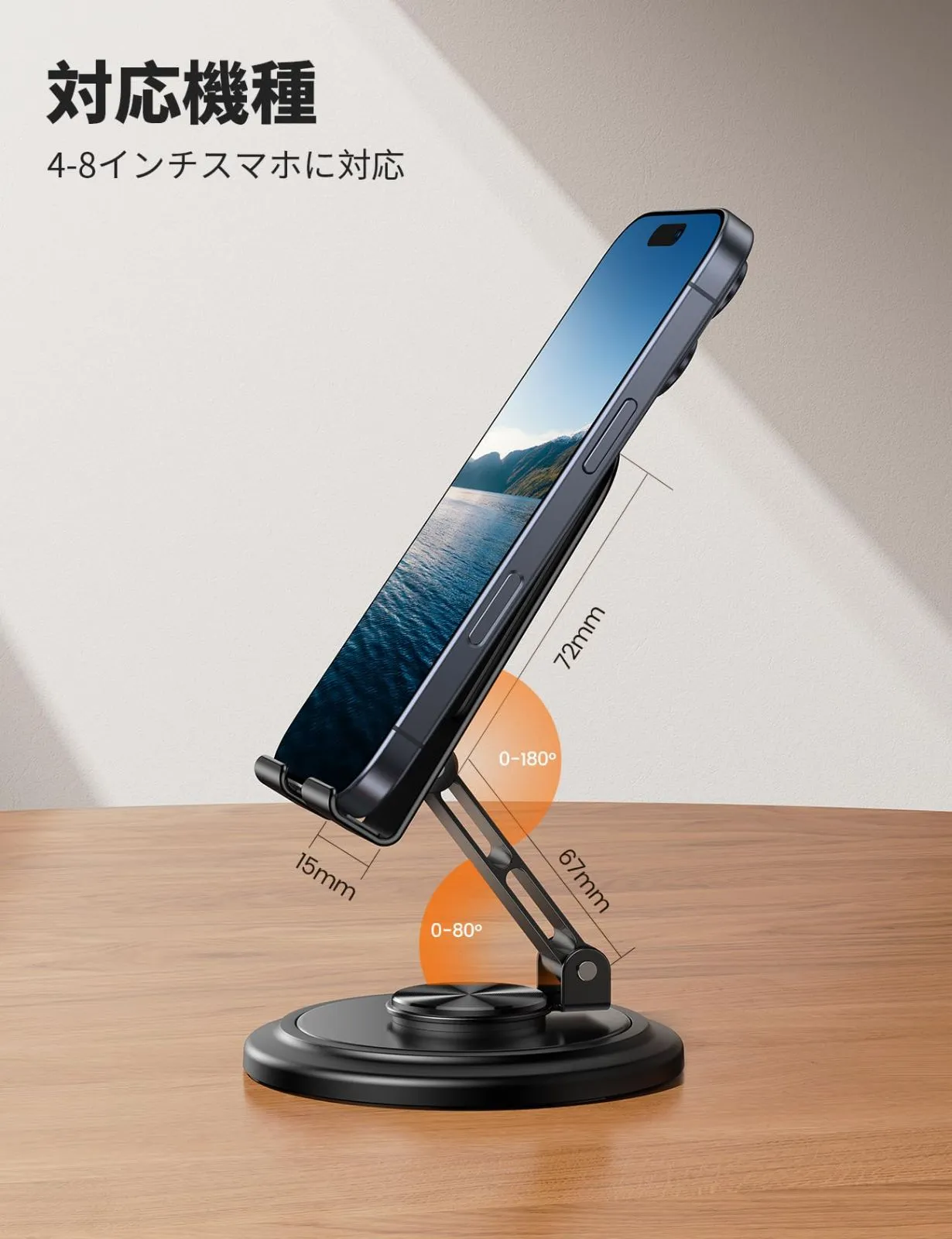 【アルミ製・安心感満々】耐衝撃性の高いアルミ合金製なので貧相さは無いですし、良い耐熱性や耐低温性に加え、非常に堅固な質があります。長く使っても壊れにくいし、ペンキも落ちにくいです。スマホに接触する面と円状の底面に滑り止め用のシリコン製パッドも付いているので、スマホを乗せても傷がつかず安心です。卓上にしっかり固定でき、スタンドの安定性を向上させます。頑丈さと軽さのバランスがとても良いスマホスタンドです。注意この製品のベースはアルミ製ではなく、ABS樹脂製で、ご購入前にぜひご注意ください。