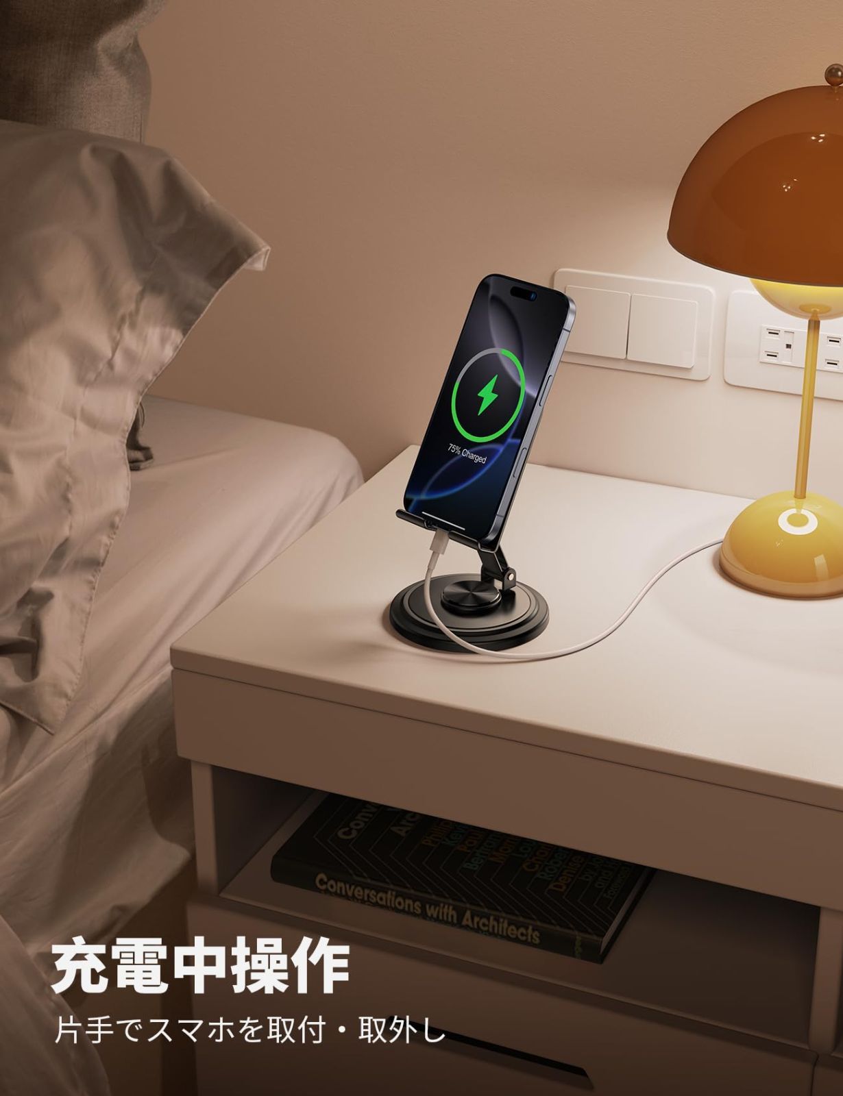 【ハンズフリー・充電しながら利用可能】スマホを固定しないタイプなので置いたり取ったりが片手でできてラク。動画を見る時や、ビデオ通話などの時にハンズフリーでき、持っていたり、デスクの上だと手や首の疲れを最小限に抑えられます。フックの先がちょっと凸になっていて、スマホの落下を防止可能です。台座から底へと十分なスペースがあるので、充電ケーブルに邪魔しないので、スタンド使用中に充電ケーブルを挿すことができて、充電しながらでも遊べます。