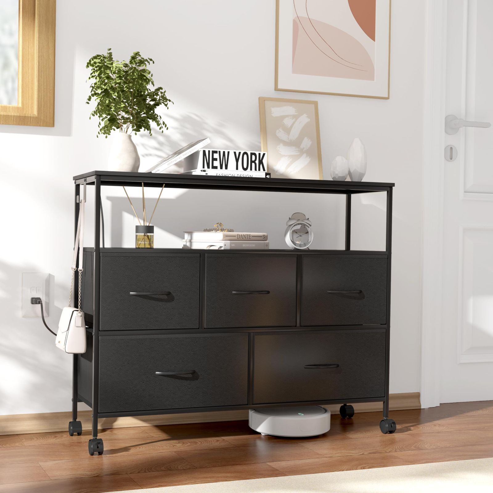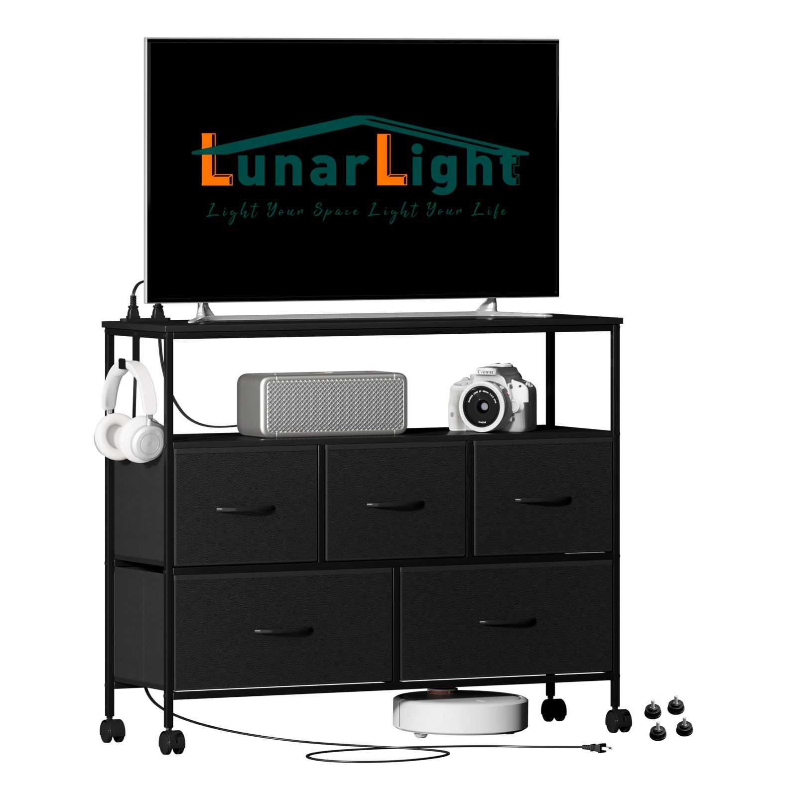 LunarLight チェスト タンス 幅100奥行30高さ78㎝ 収納チェスト 収納ケース コンセント2口付き キャスター付き ストッパー付き 移動式と固定式2機能 テレビ台としても使える 頑丈 組立簡単 耐震転倒防止 大容量収納 引き出し2段5杯 棚板2枚(ブラック)