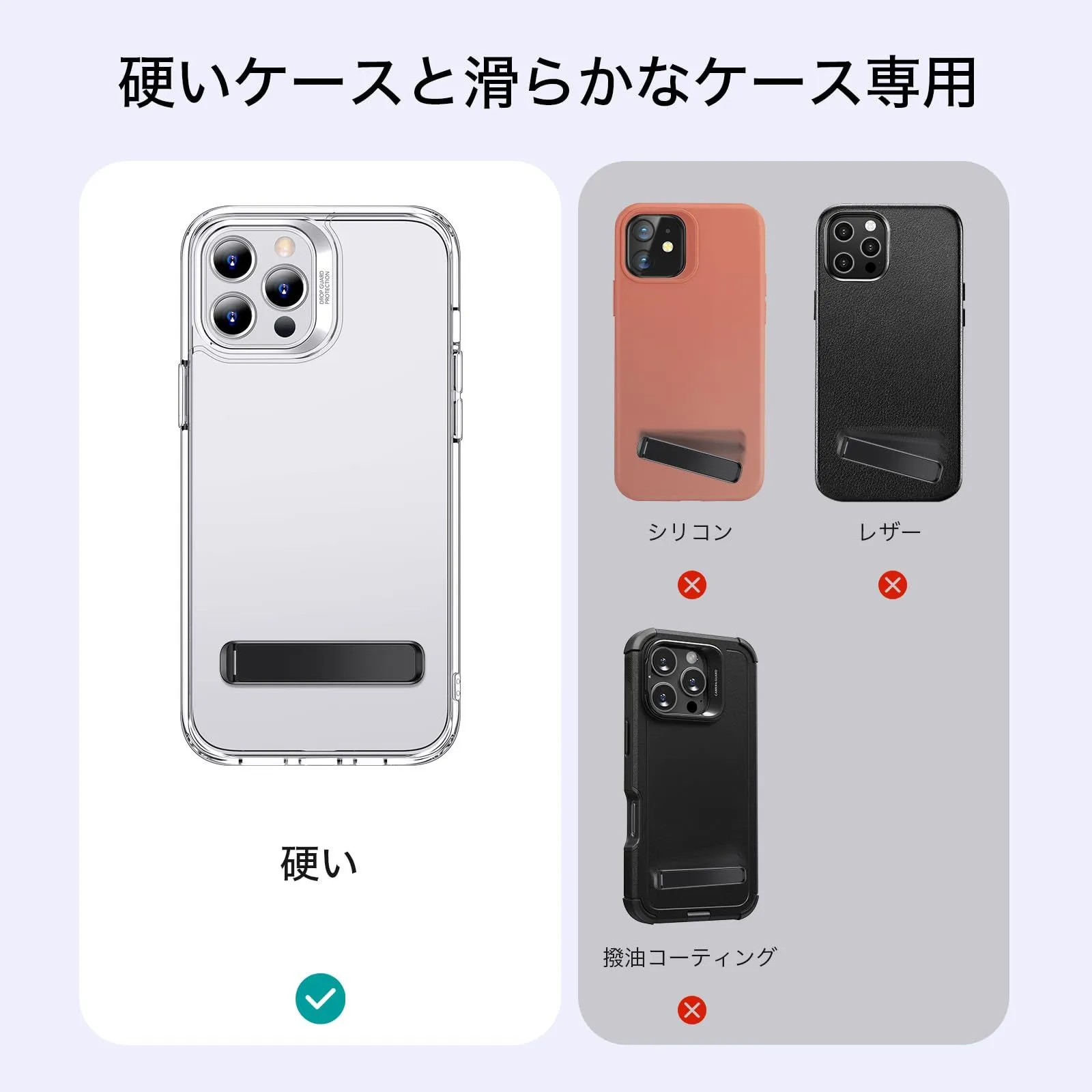 注意: 1.なめらかな表面にのみ貼り付けることができます。レザー製スマホケースやつや消し加工されたスマホケースでは使用できません。 2.スマホの下端から約2cmの位置に貼り付けてください。下端から3cm以上上の位置に貼り付けるとスマホを立たせることができません。