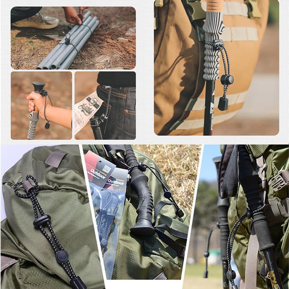 【簡単取付&調節可能】リュックのベルトやバックルに簡単に取り付け可能。ポールの太さに合わせてロープを調整でき、しっかりと固定されズレにくい構造です。