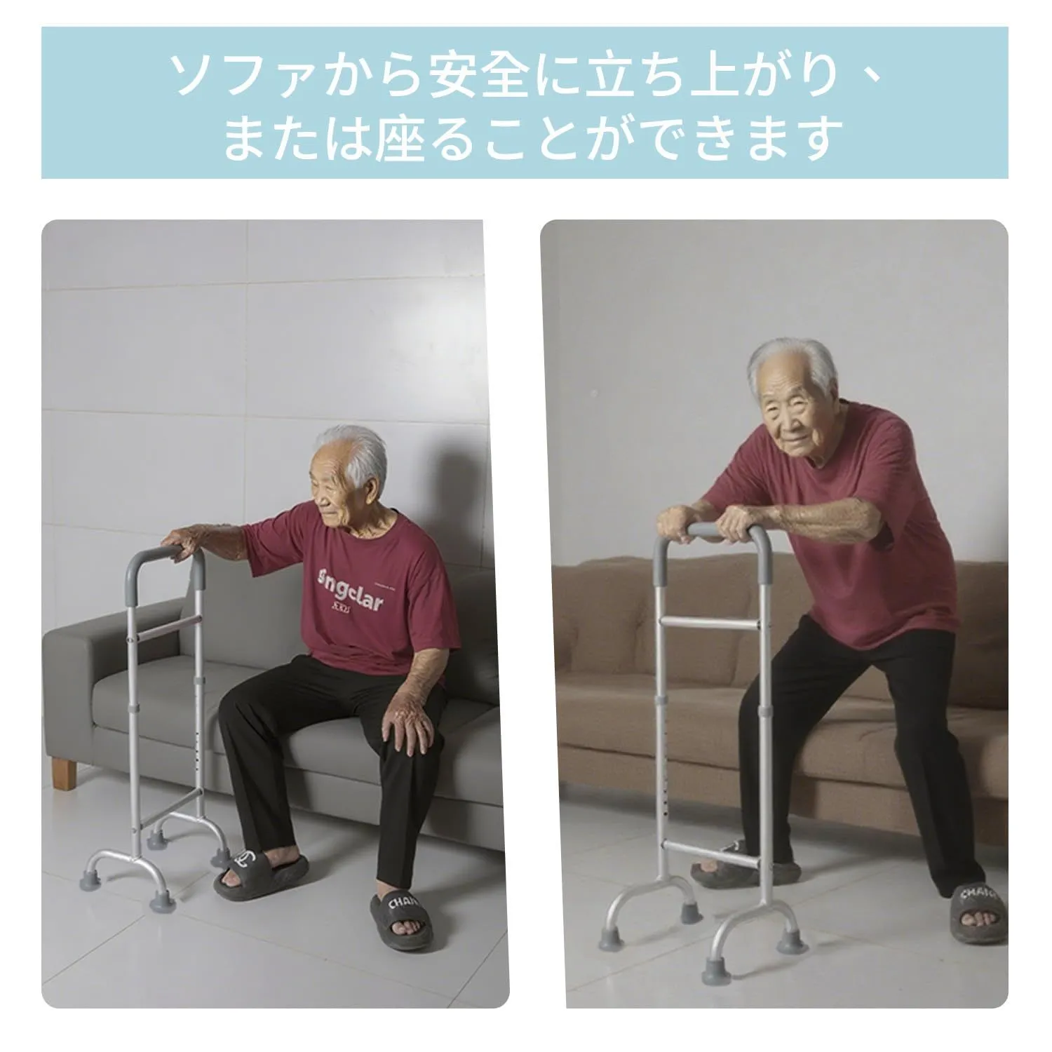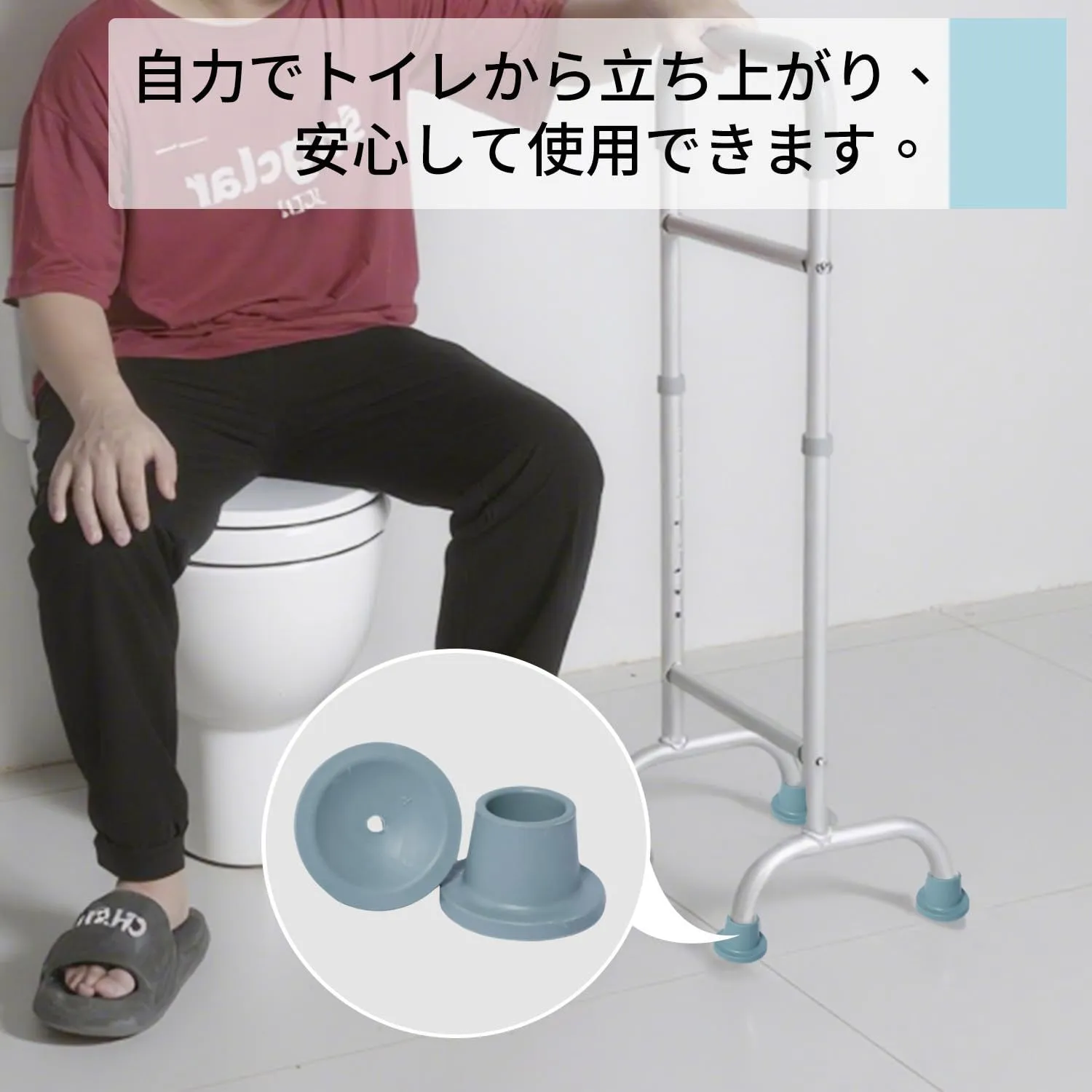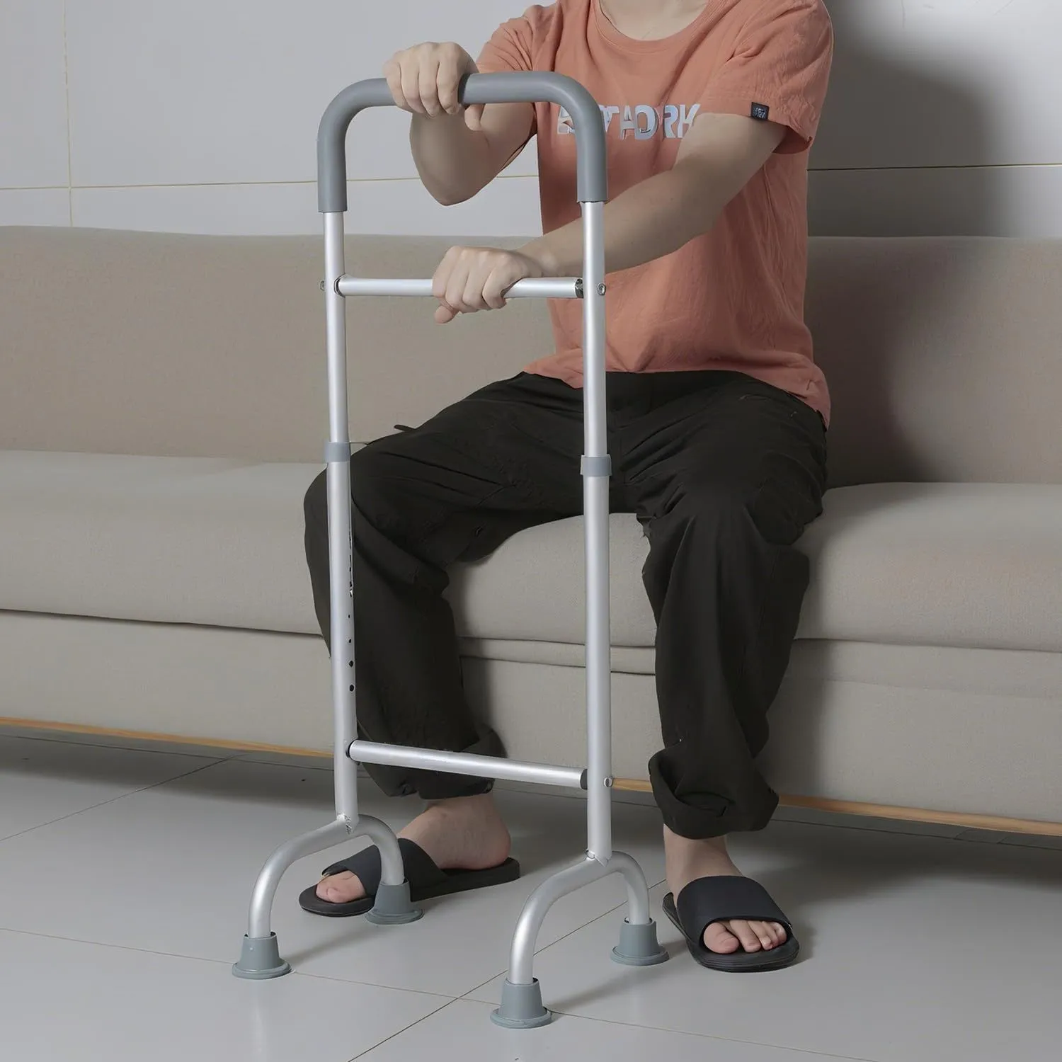 【安全と安定性】 この介護用手すりは、頑丈な構造でユーザーの安全を優先します。最上部の手すりは防滑ゴムで包まれており、しっかりしたグリップを提供し、4つの角の吸盤が地面との摩擦を高め、滑りを防止します。U字型デザインが優れた安定性を確保し、ユーザーは主に中央の横棒で体重を支えることを推奨します。もう一方の手で最上部の手すりを補助的に支えることで、さらに安定性が向上します。