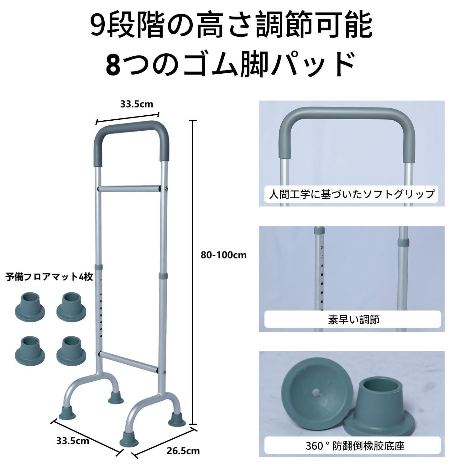 【介護士監修】 介護用手すり 立ち上がり補助器具 トイレてすり 高さ調整 滑り止め付き 床 補助 つかまり立ち 転倒防止 玄関 室内 屋内 屋外 グレー 銀