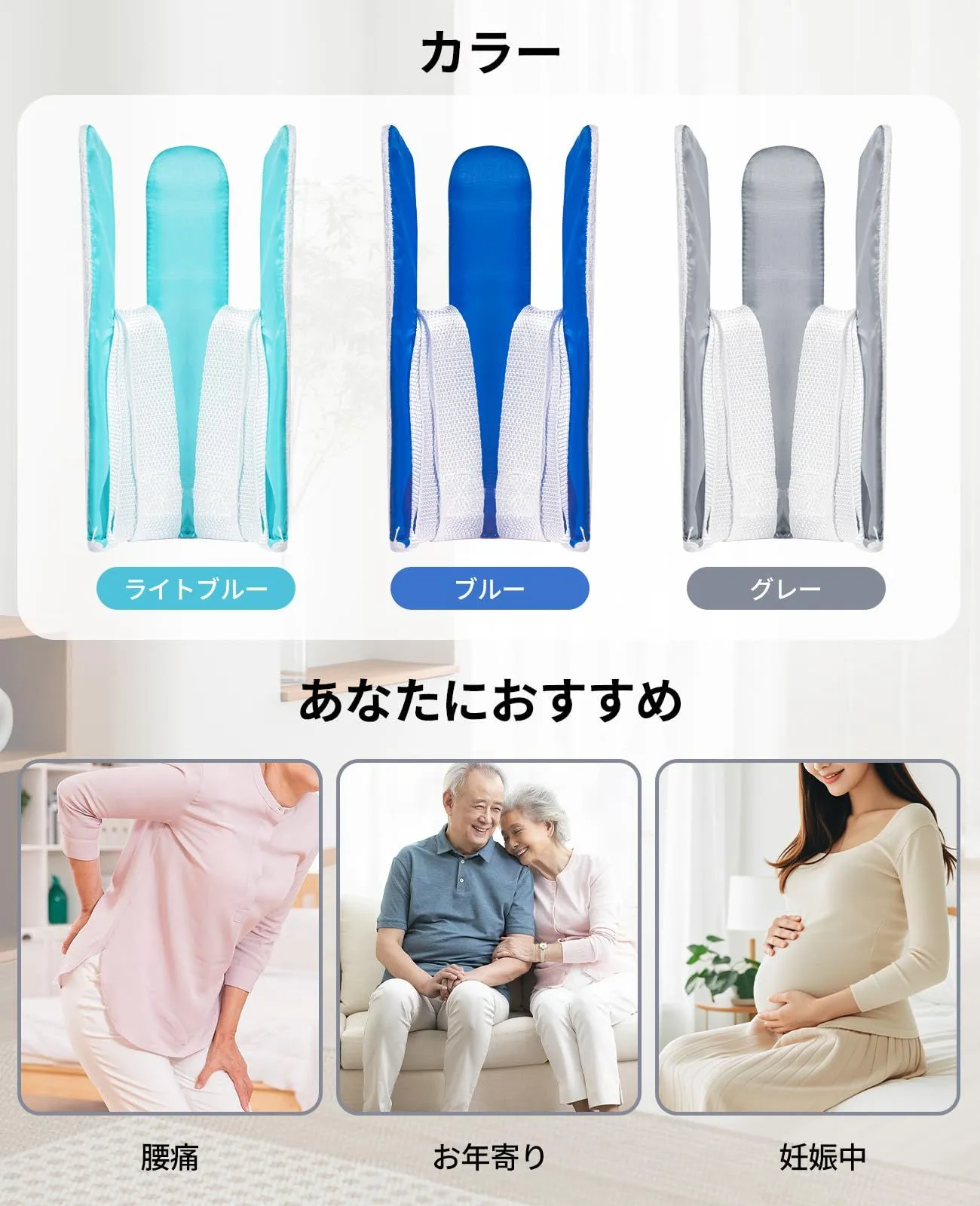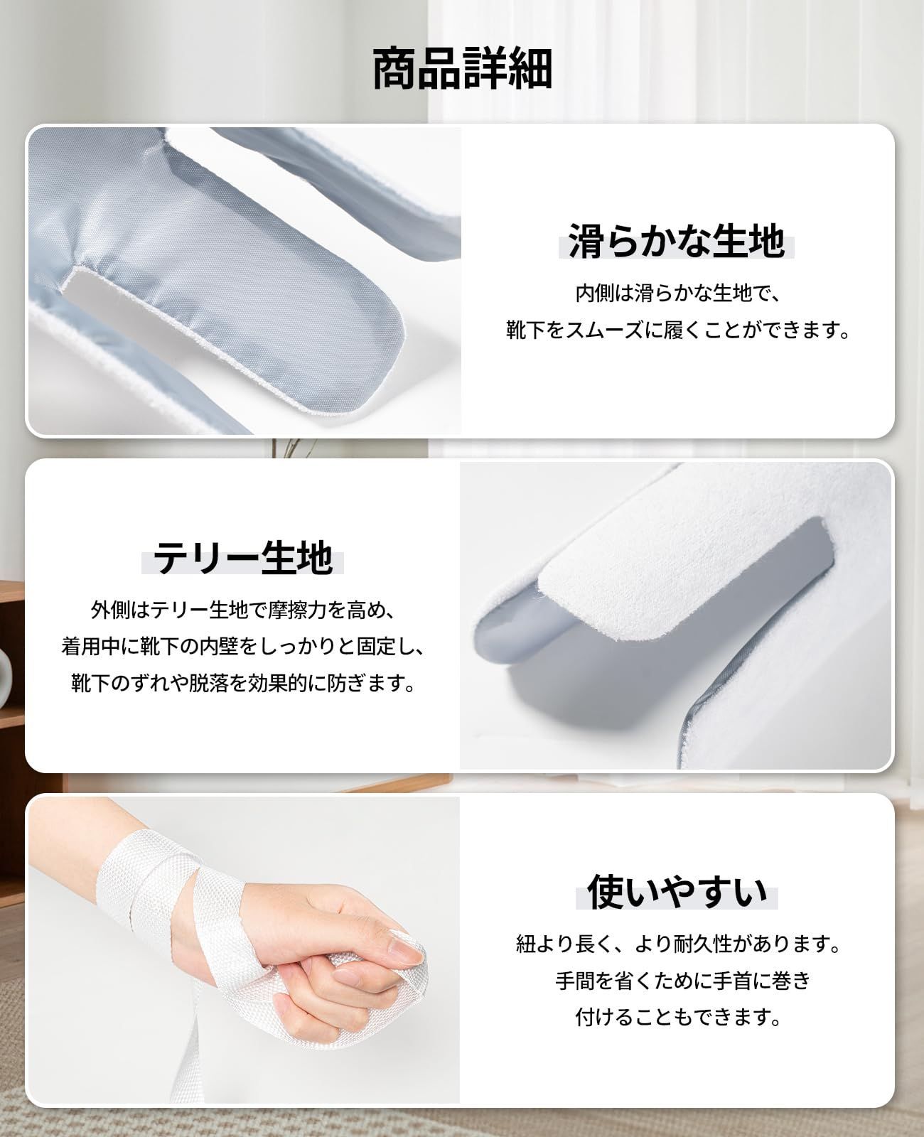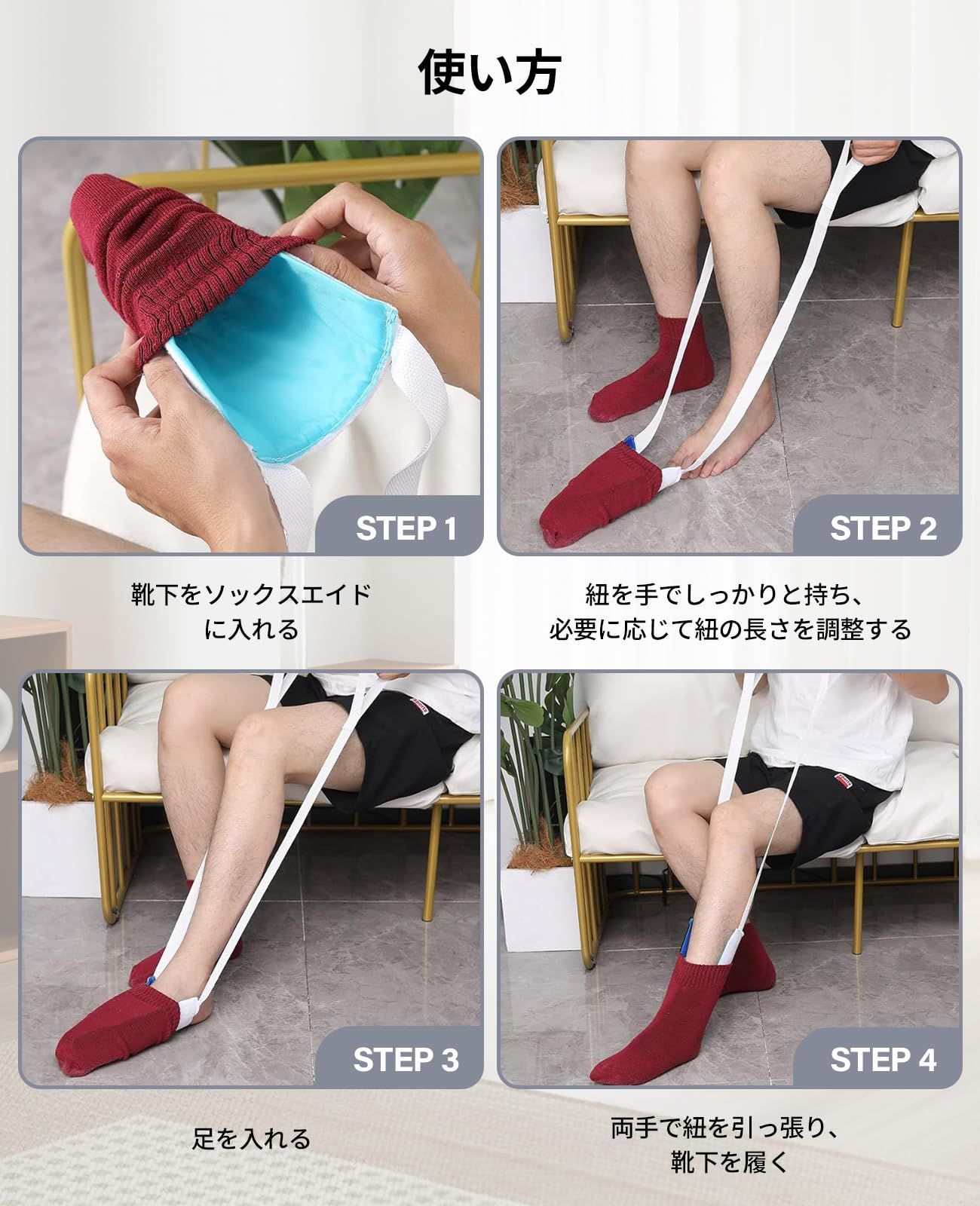 ソックスエイドは、一人で靴下を履くことができます。高齢者、妊婦などに適しています。また、腰痛や関節痛などの同様の症状のある人にも適しています。使い方は簡単で、靴下を履くには4つのステップしかありません。まず、靴下を靴下補助具に入れます。次に、紐を両手でしっかりと持ち、必要に応じて紐の長さを調整できます。それから、足を入れることです。最後に、両手で紐を引き上げ、靴下を履きます。全体的な着用は非常に便利で、一人で行うことができます。靴下履き補助具はグレー、ライトブルー、ブルーの3色からお選びいただけます。