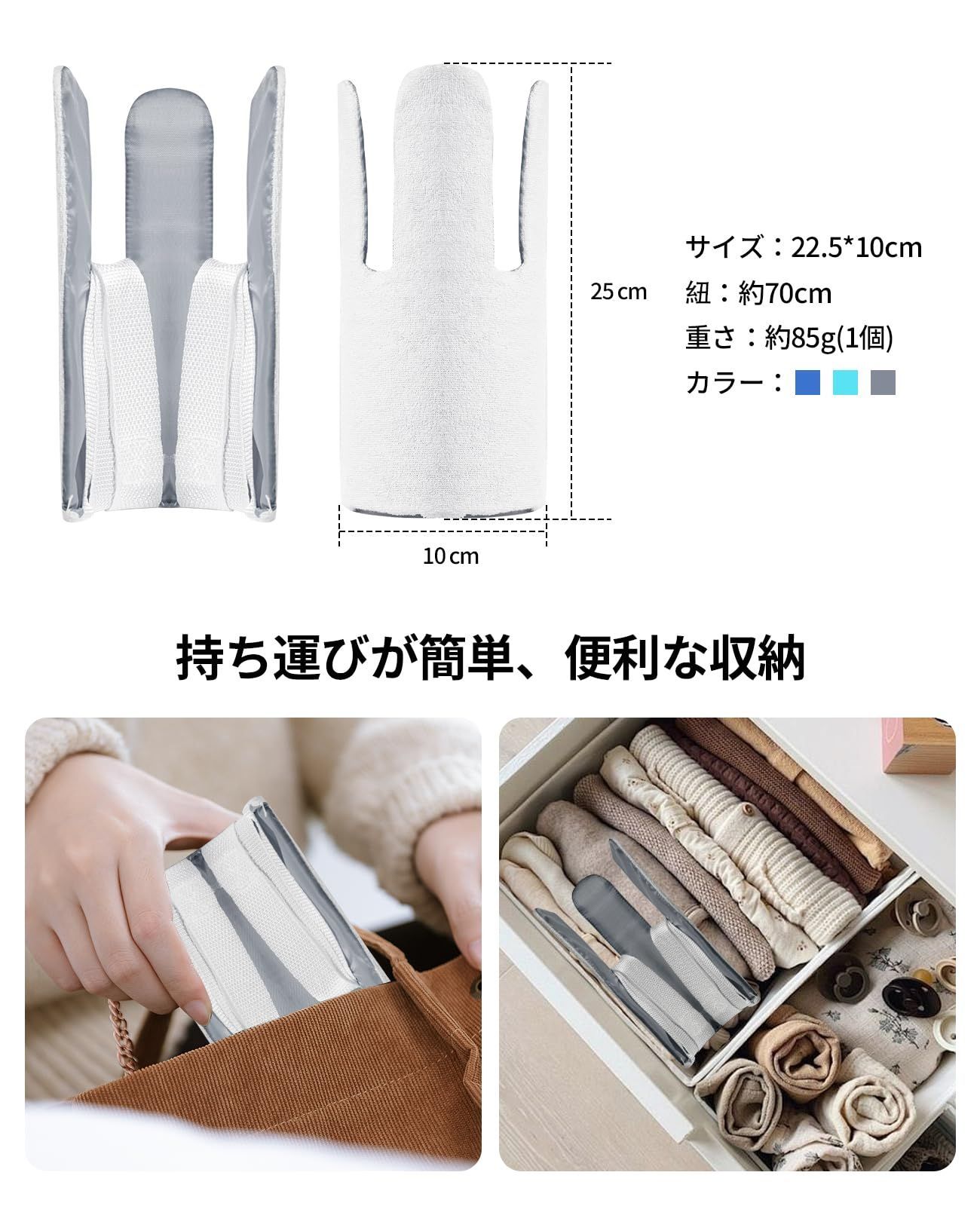 【商品仕様】ソックスエイドは1個です。サイズ:長さ約22.5cm、幅約10cm、ロープ約70cm、重さ約85g。軽量なので収納や持ち運びも簡単です。
