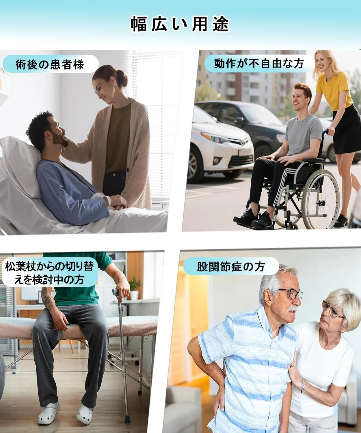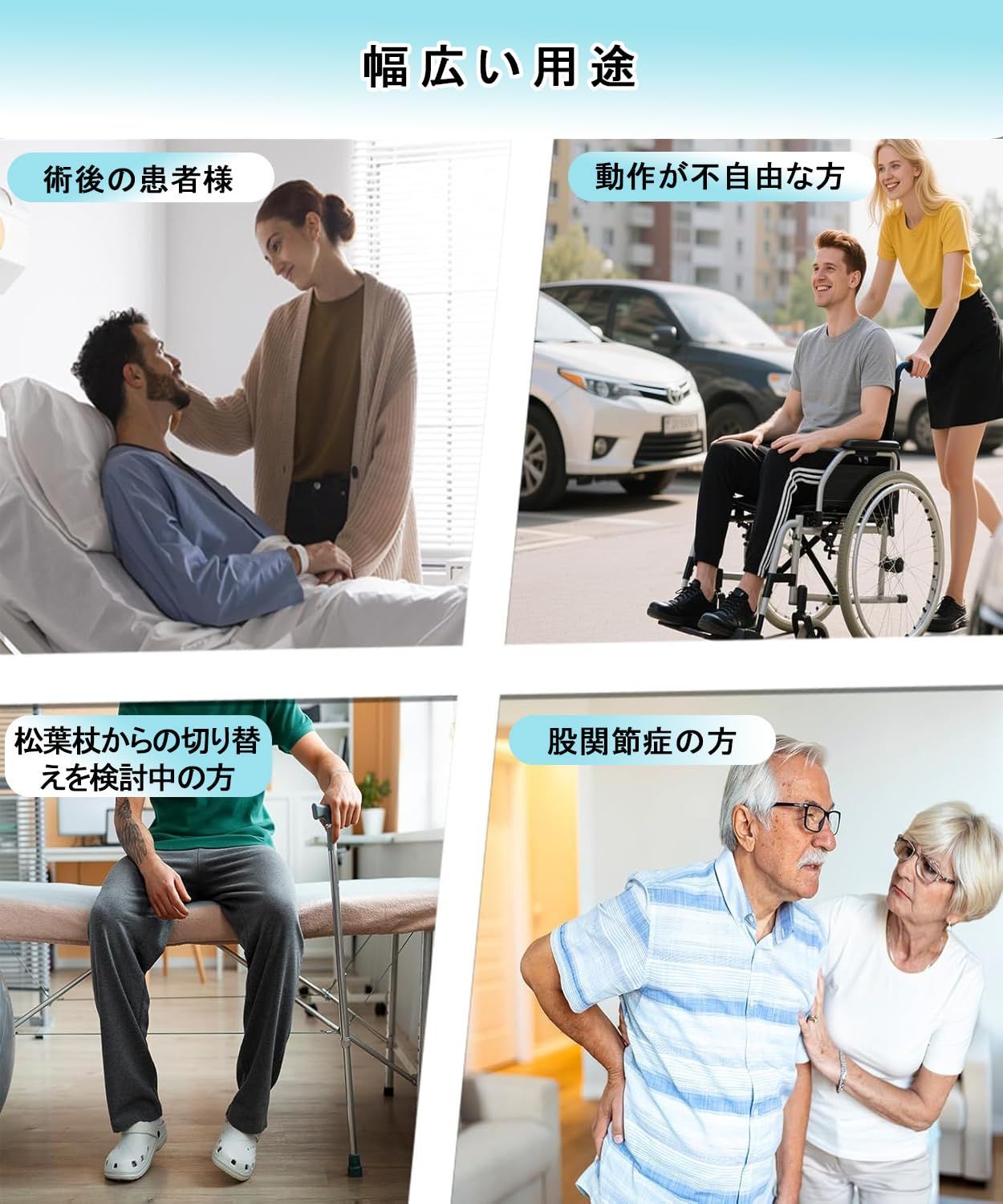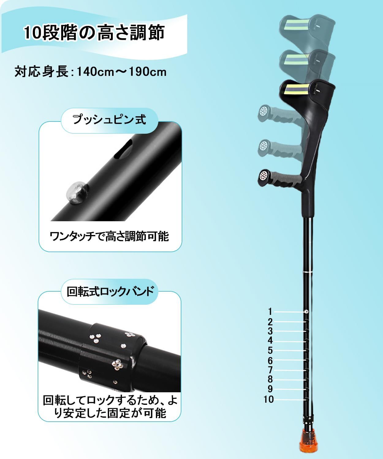 【10段階高さ調節】ボタン式調節機構を採用し、140-190cmの身長範囲に対応。様々な使用場景に応じて高さを精密に調整でき、正しい歩行姿勢の維持をサポート。成長期のお子様から高齢者まで全年齢層のニーズを満たします。