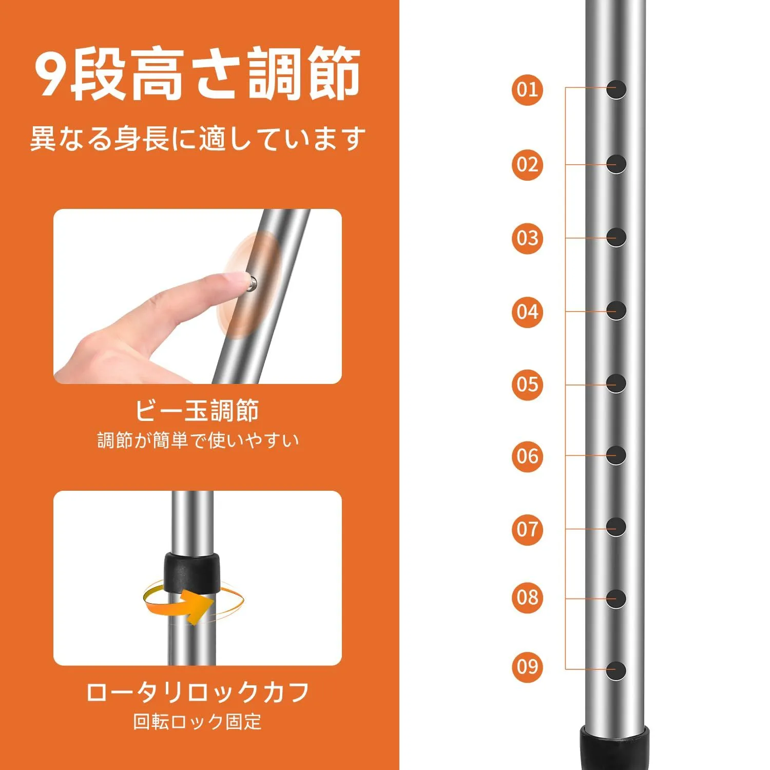 【9段階調節と折り畳み式】ワンクリックで調節でき、9段階の高さを調節できる。身長に合わせて調整できるので、160 cmから180 cmの人に適しています。数秒で折りたたむことができ、旅行にも外出にも便利で負担になりません。