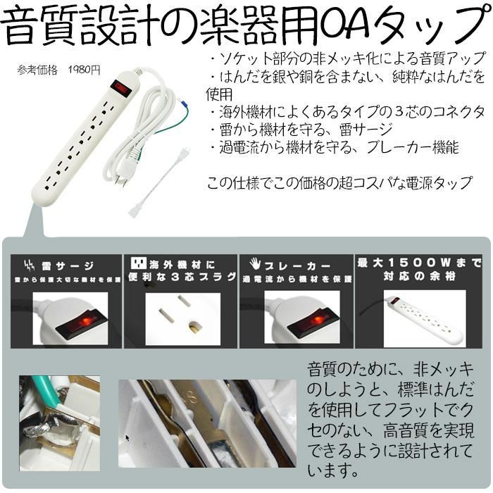■AC アダプター対応延長コード 機材の為のといって過言で無い完璧な仕様の OA タップ! ・ソケット部分の非メッキ化による音質アップ ・はんだを銀や銅を含まない、純粋なはんだを使用 ・海外機材によくあるタイプの3芯のコネクタ! ・雷から機材を守る、雷サージ ・過電流から機材を守る、ブレーカー機能 この仕様で、この価格はあり得ません!!メーカーに交渉により超破格を実現しました!!!